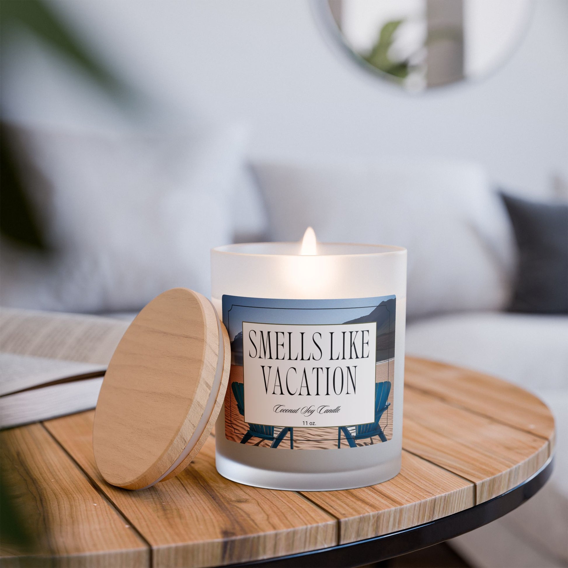 Artisanal Coconut Soy Frosted Glass Candle with Wooden Wick and Raw Maple Lid 11 oz Hand Poured Ocean Beachy Vacation Candle 50 hr burn time
