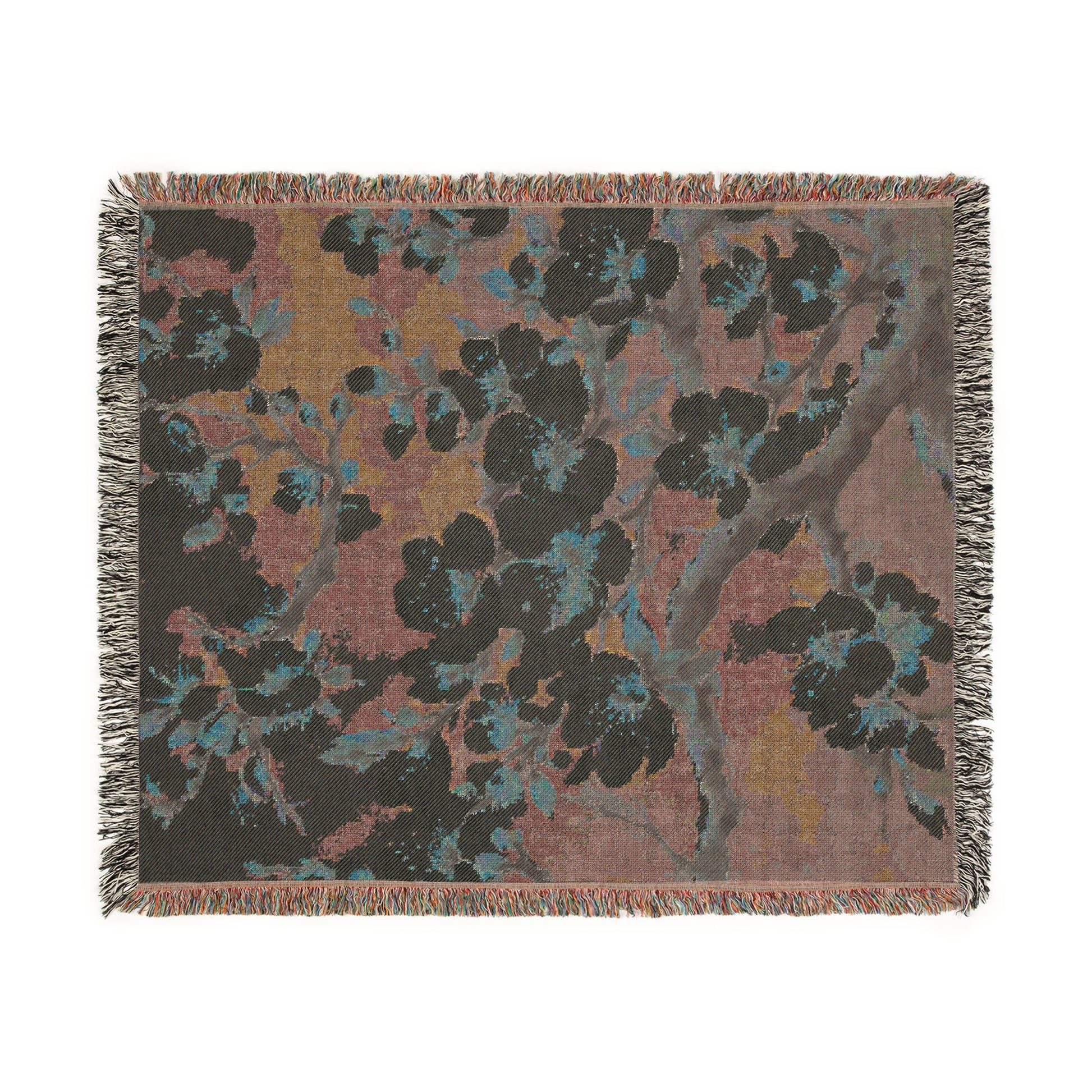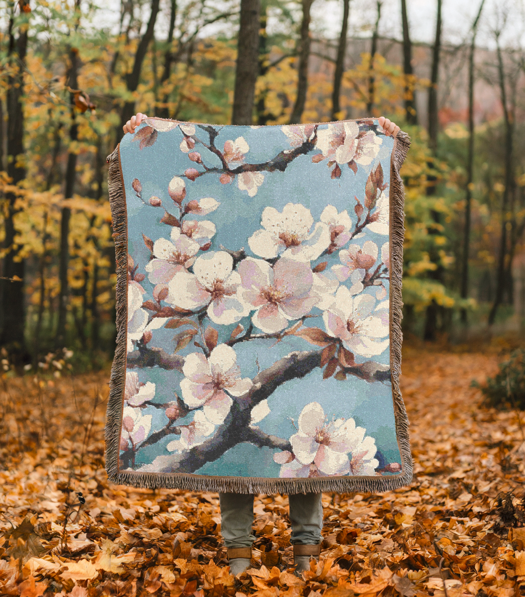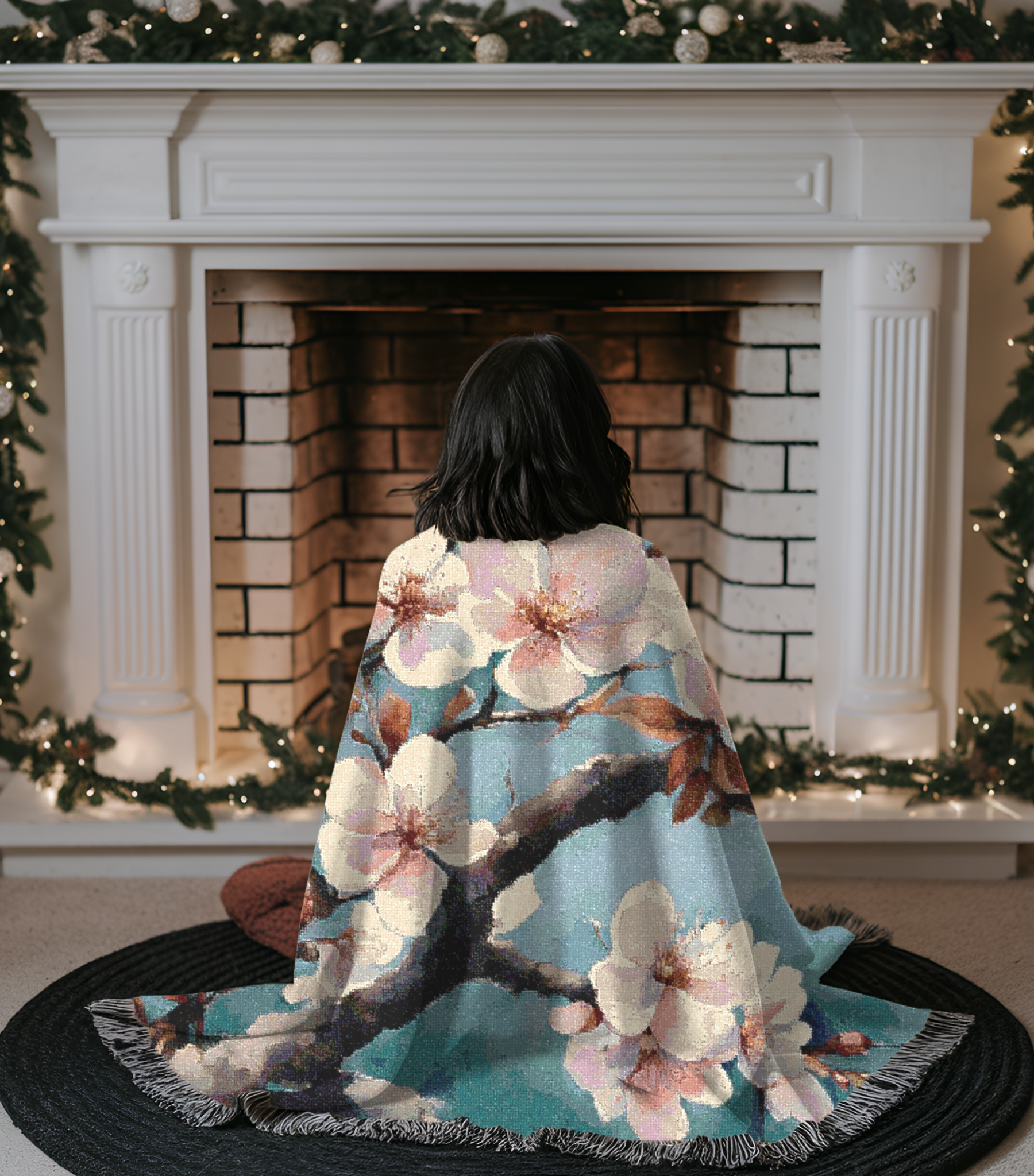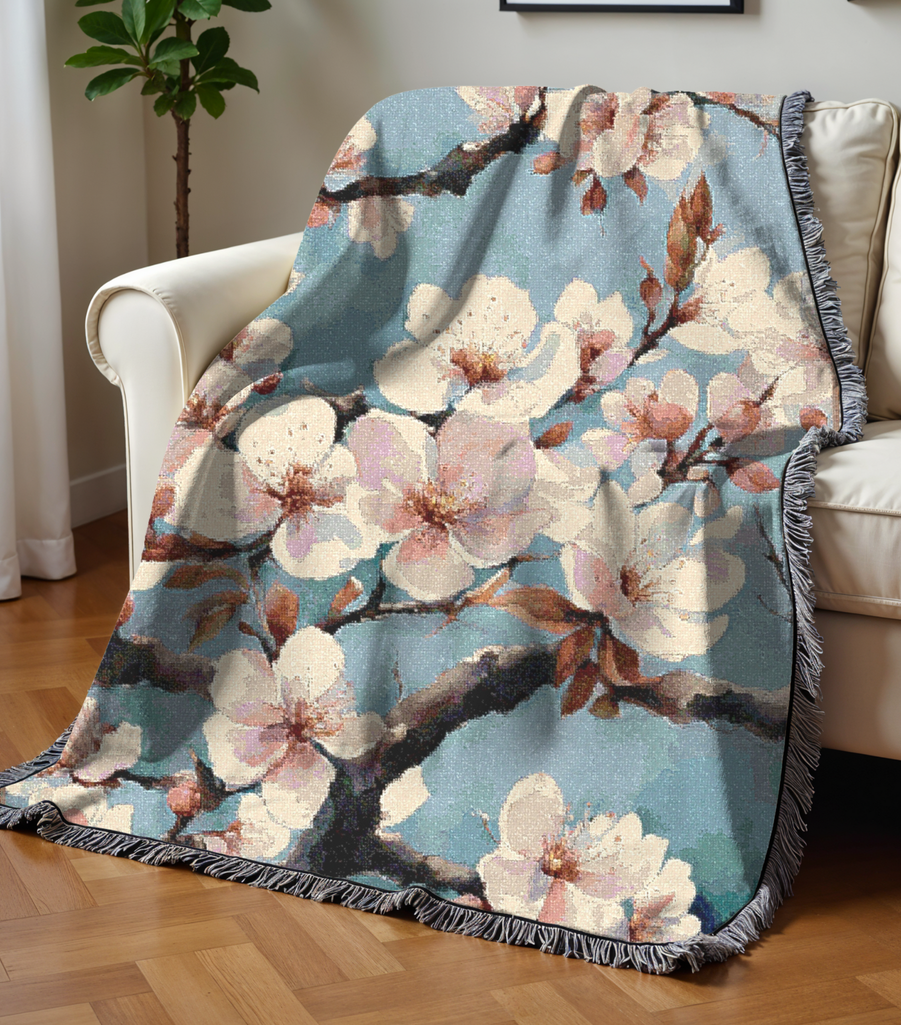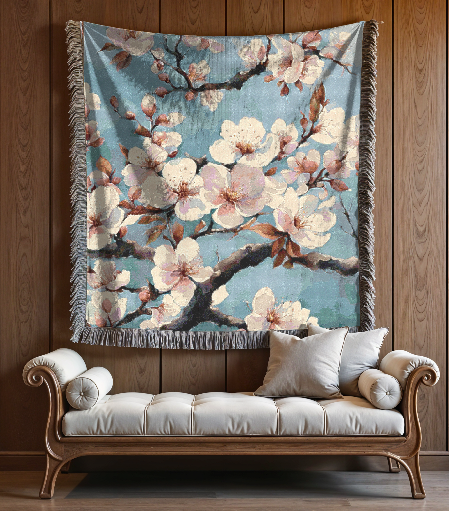 Asian Art Style Plum Blossoms Cozy Reading Throw for Book Lovers Cotton Woven Fringed Picnic Blanket Wall Art