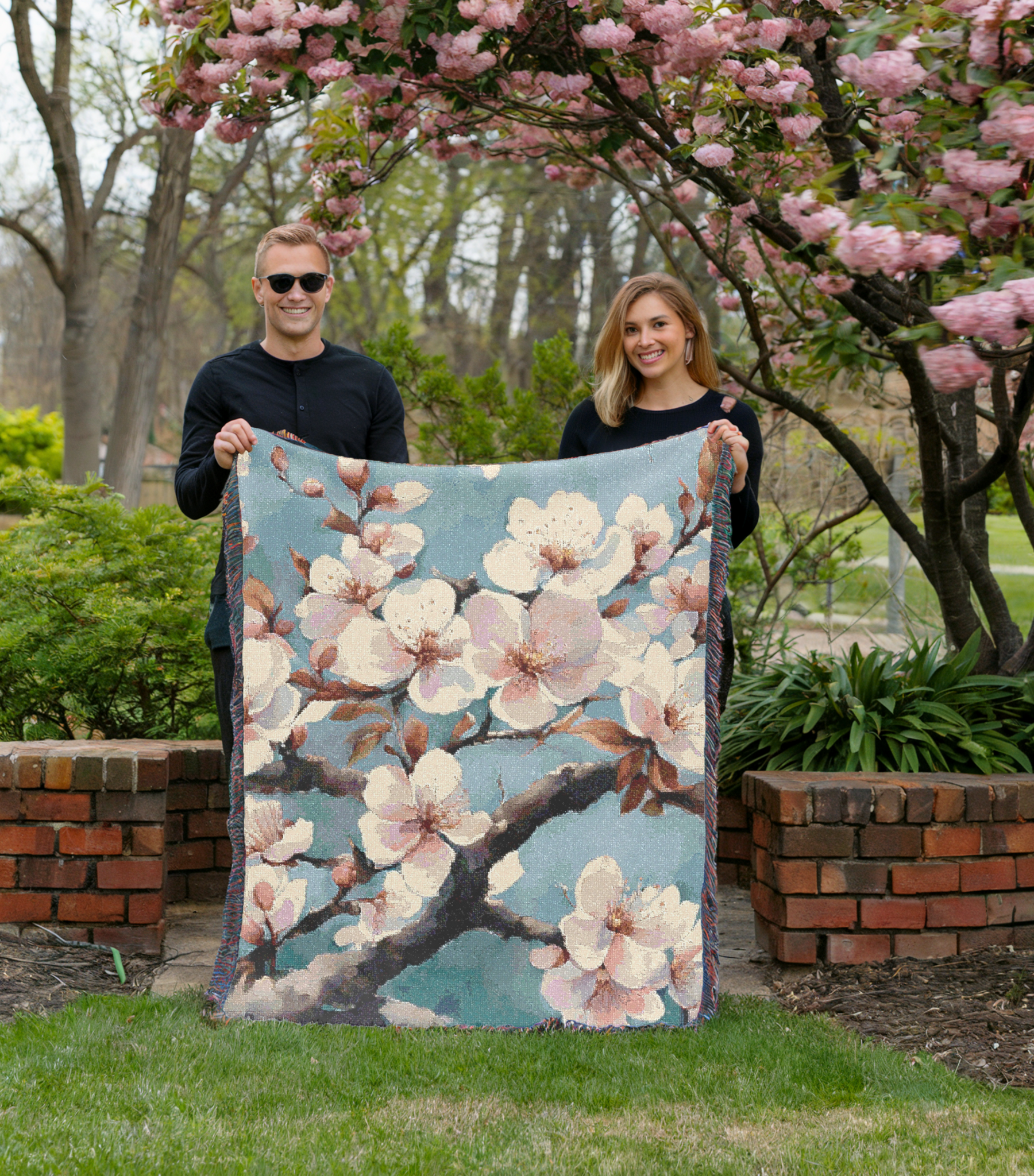 Put them up on the wall for a cozy display or use it to cuddle up on your couch. These cozy throw-sized woven blankets are woven out of 100% cotton yarn with a colorful edge fringe that extends the image.