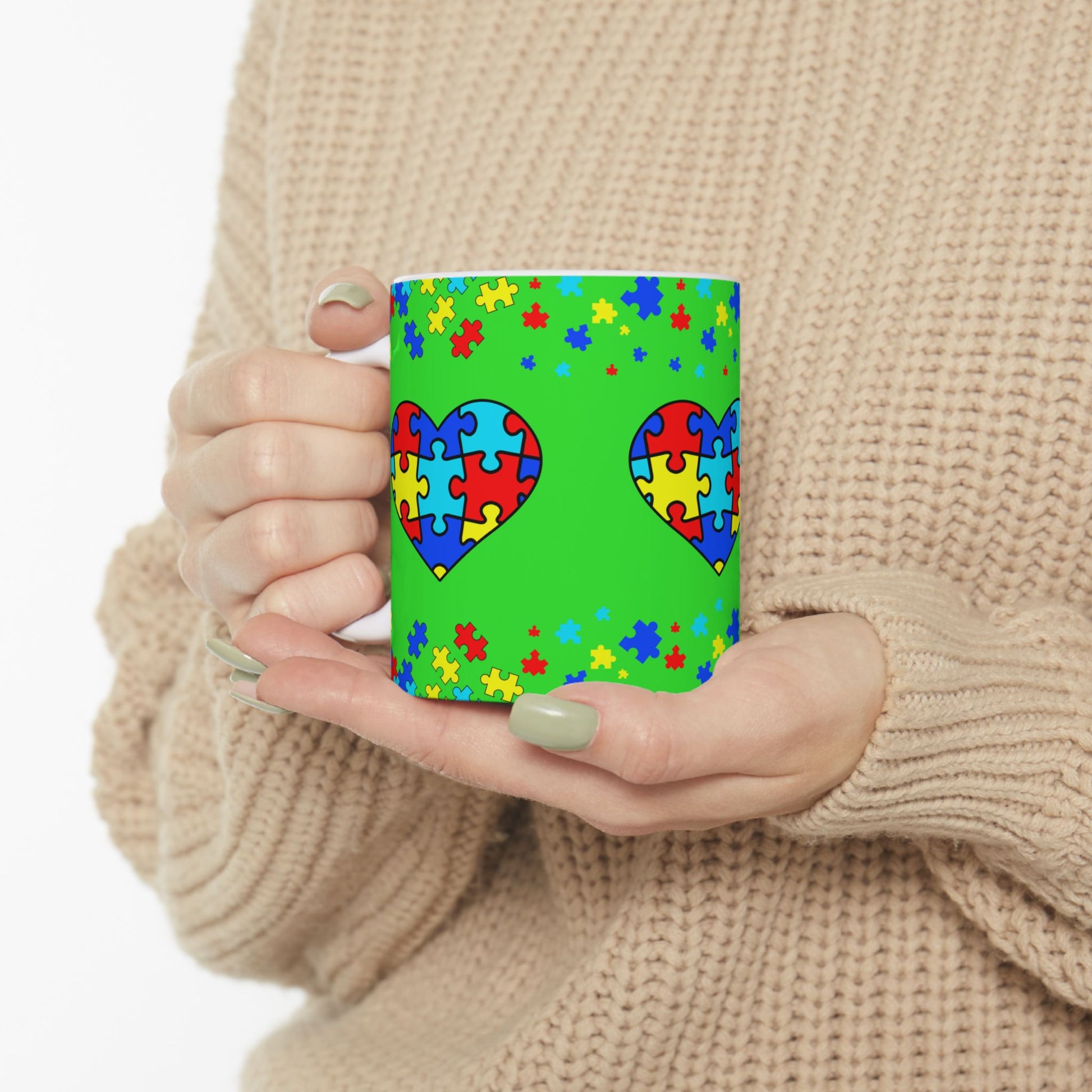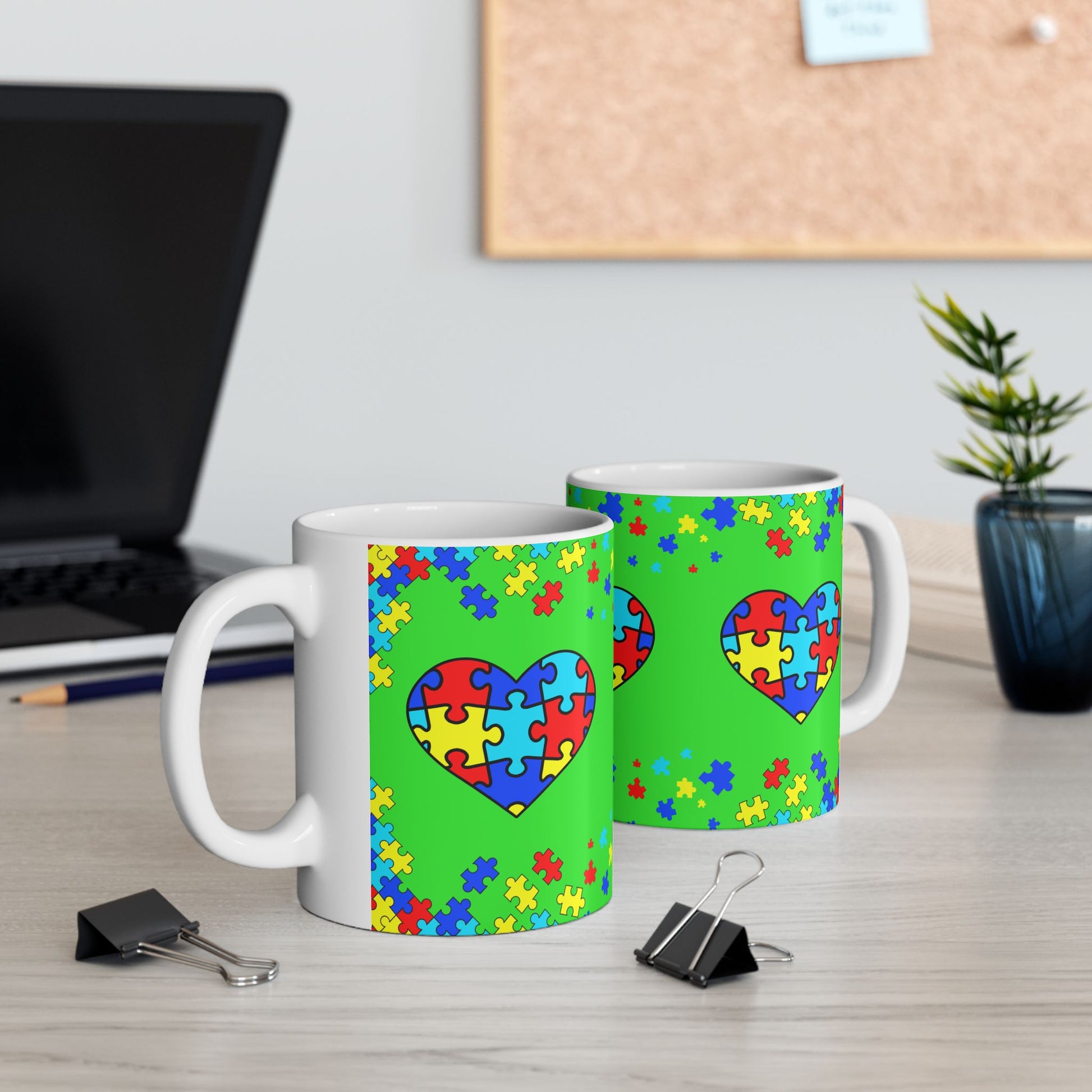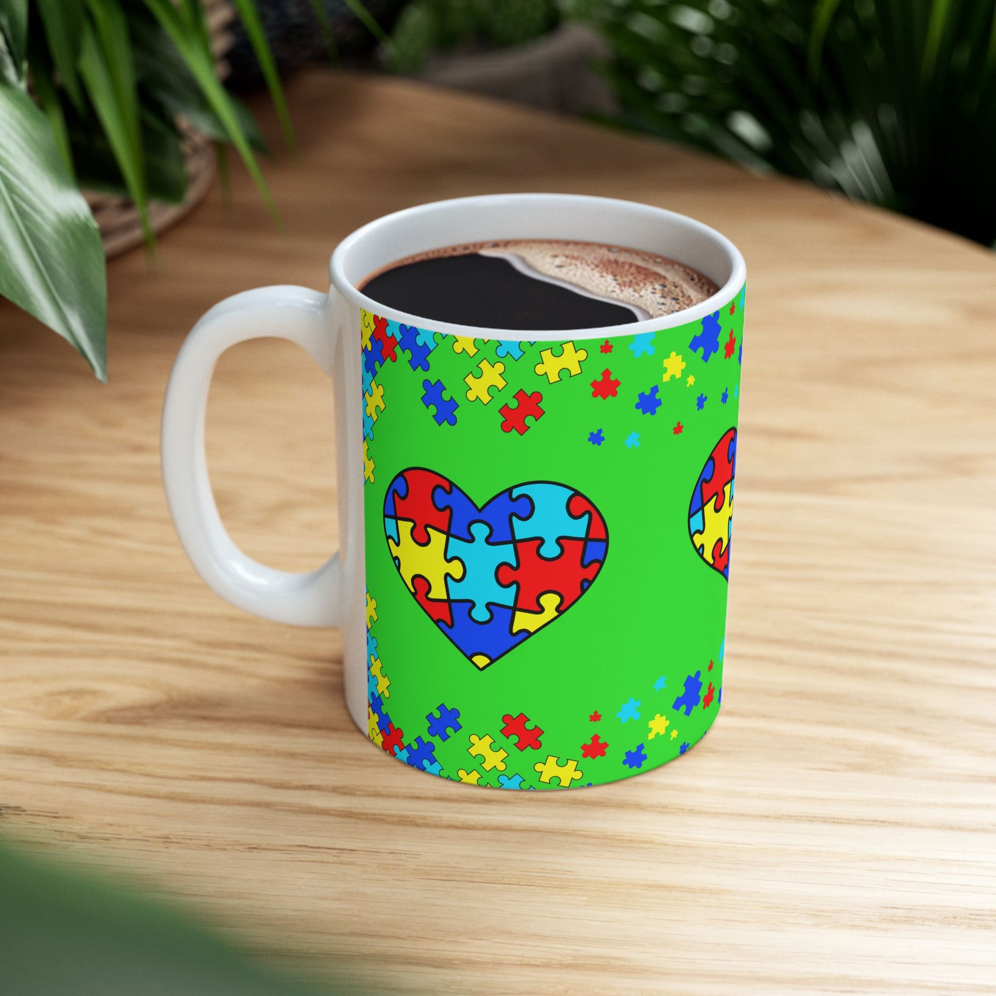 Colorful Autism Puzzle Piece Mug perfect for coffee, tea and hot chocolate that makes a great gift for yourself or the special people in your life! We've created a beautiful image that is sublimated onto a ceramic mug and wraps around the mug. It's BPA and Lead-free, microwave & dishwasher-safe, and made of white, durable ceramic in 11-ounce size. The perfect gift for coffee, tea, and chocolate lovers. All mugs feature a comfortable C-handle and a shiny finish so that they're both easy to use and great to look at. This is a great gift for the hard to shop for person in your life.