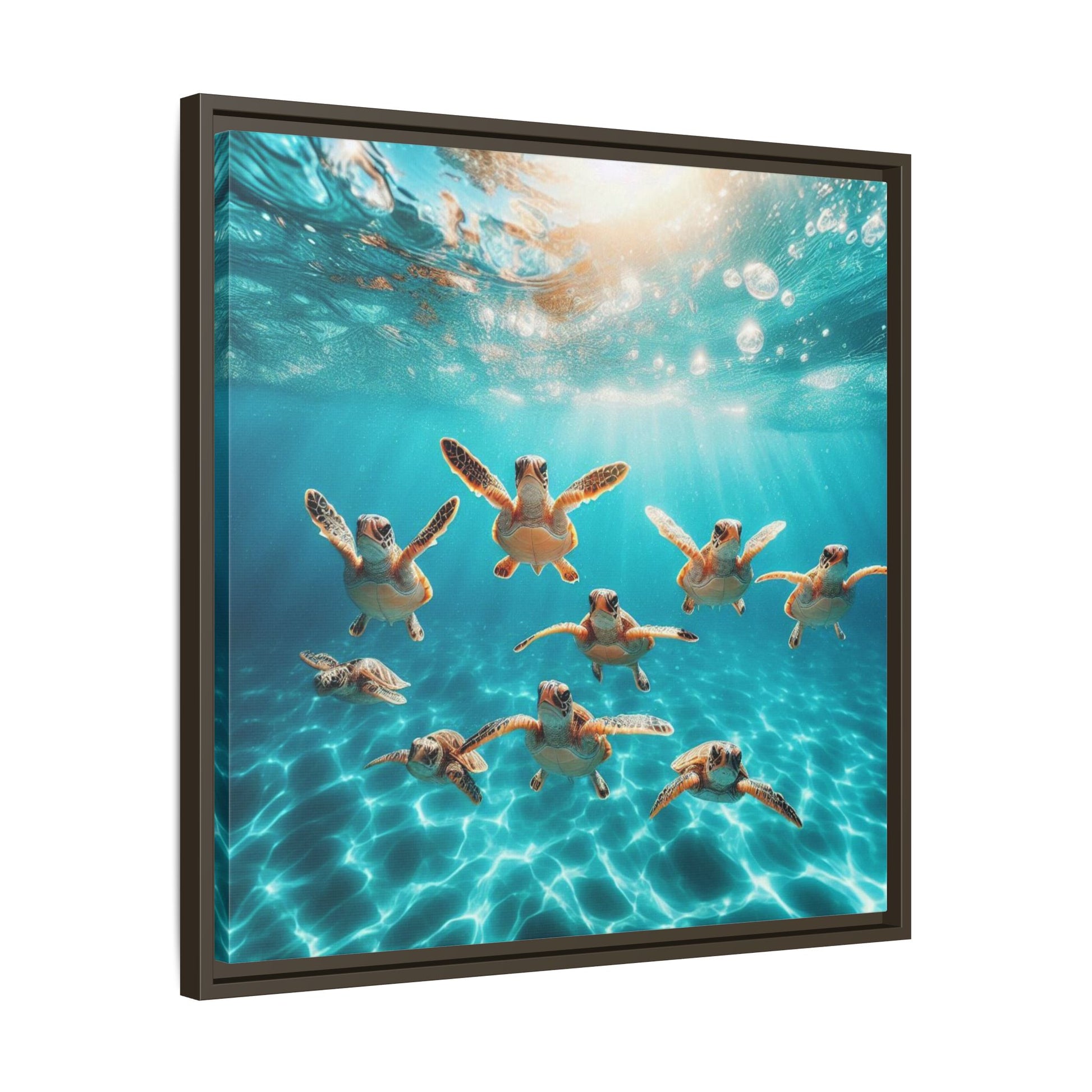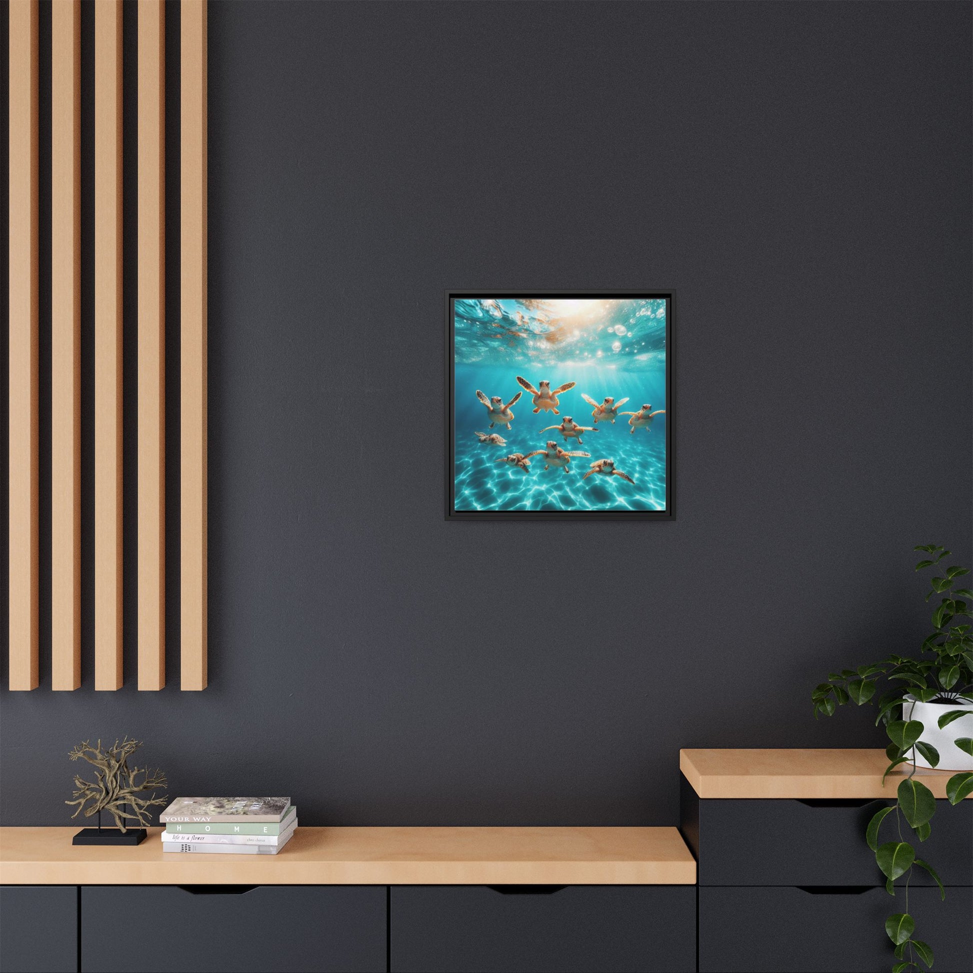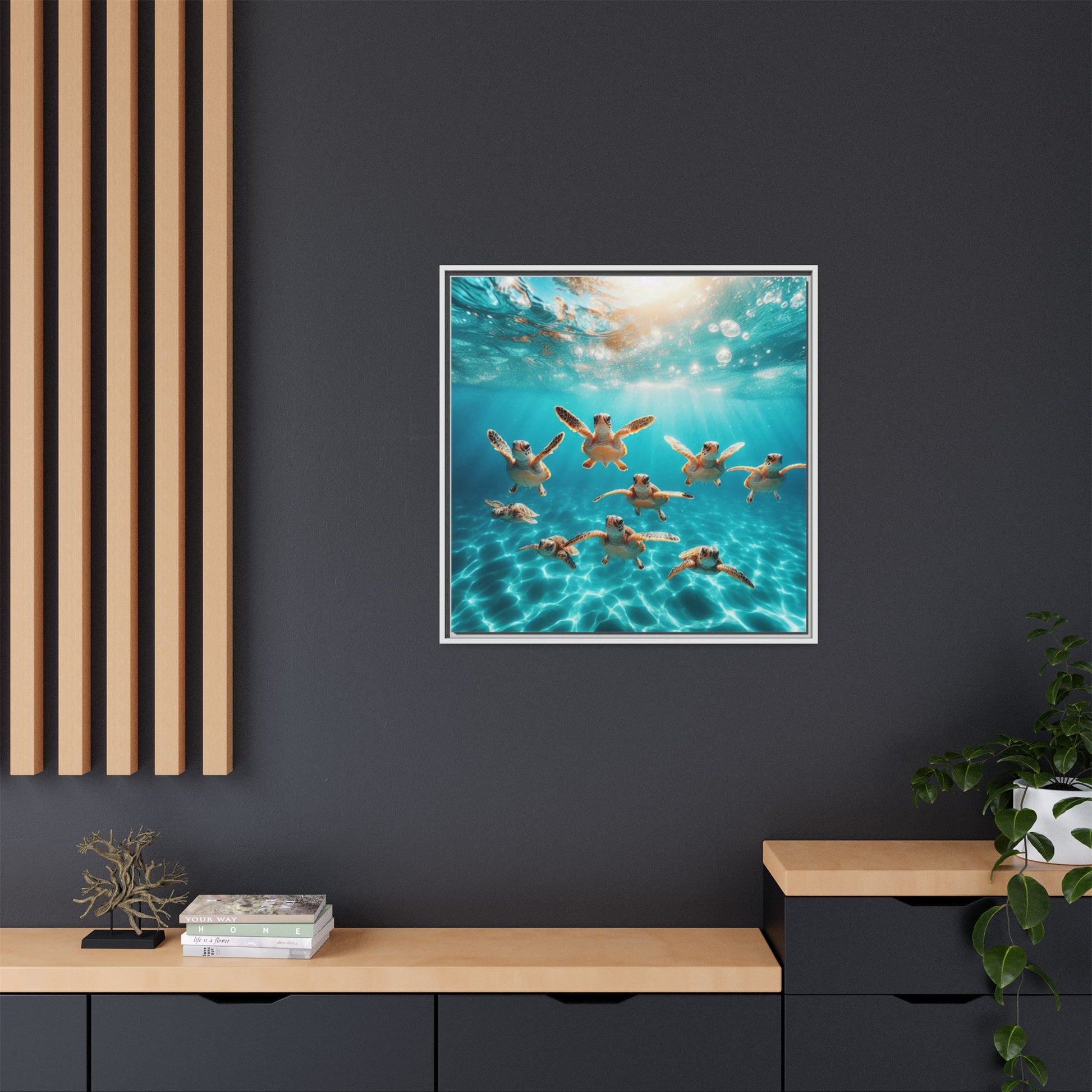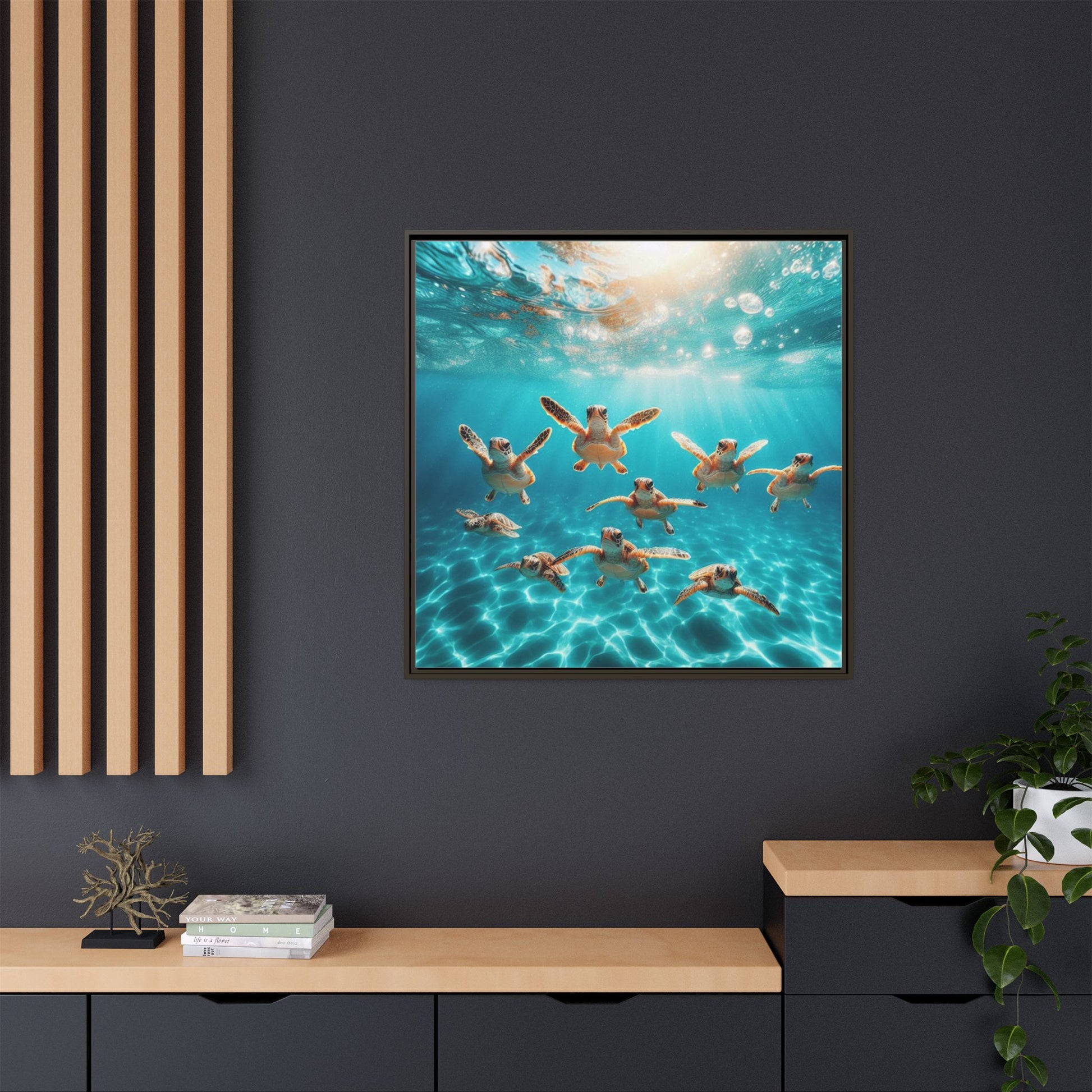 Baby Sea Turtles Out for a Swim Framed Canvas Wall Art Beach Lover Vacation Oceanic Gift Nature Lover Peaceful Zen Gift 3 frame colors