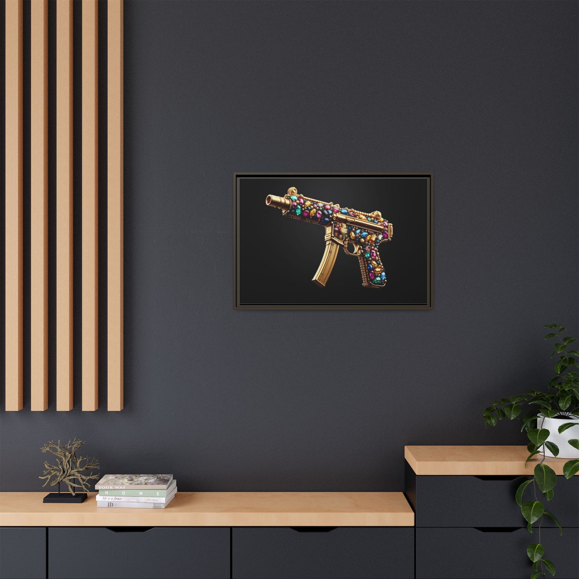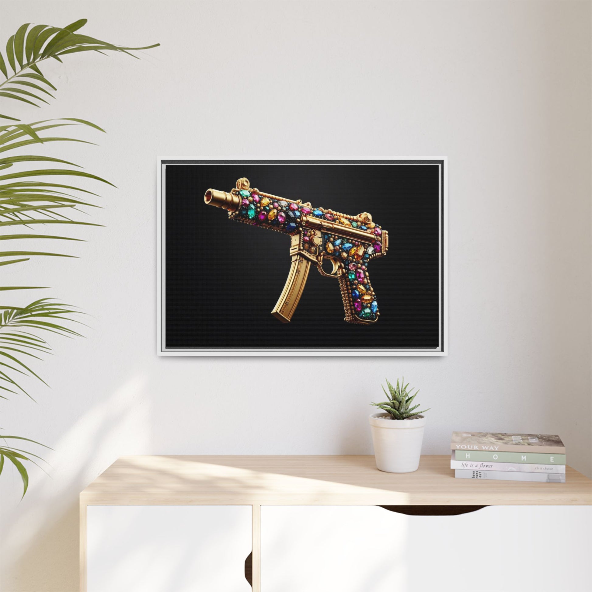 Bejeweled Machine Gun Print AI Design Unique Framed Canvas Print Wall Art Gun Lover Gift Edgy Glam Fantasy Weapon Decor 3 frame colors