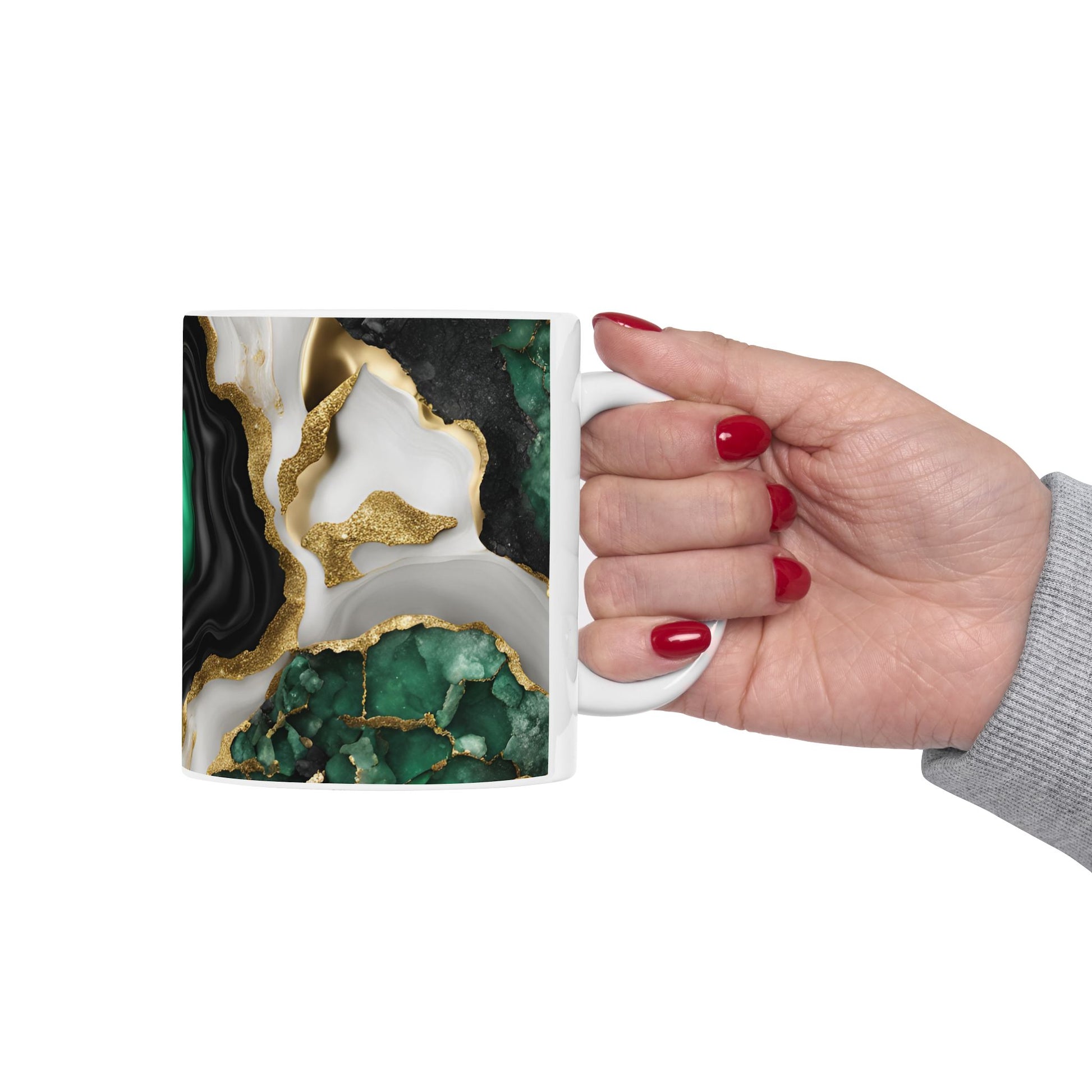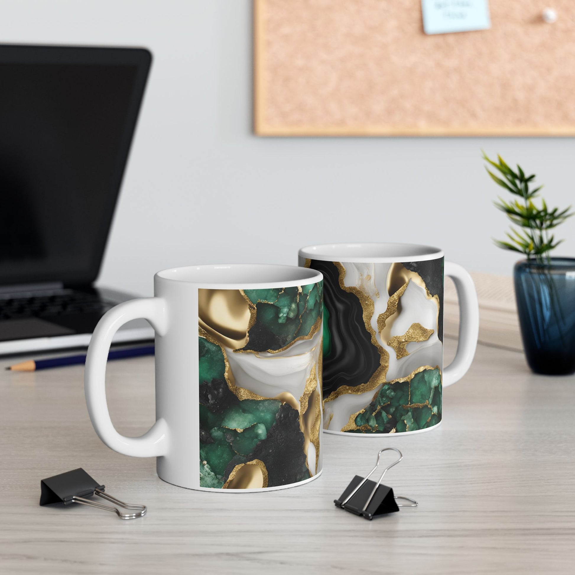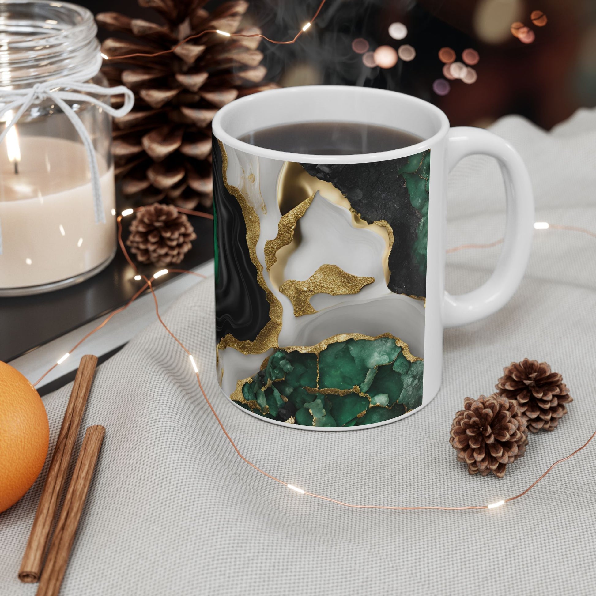 Black, White, Emerald Green and Gold Crystal Geode Design Coffee Tea Mug Boho Gemologist Gift Nature Lover Marble Rock Agate Geology Gift