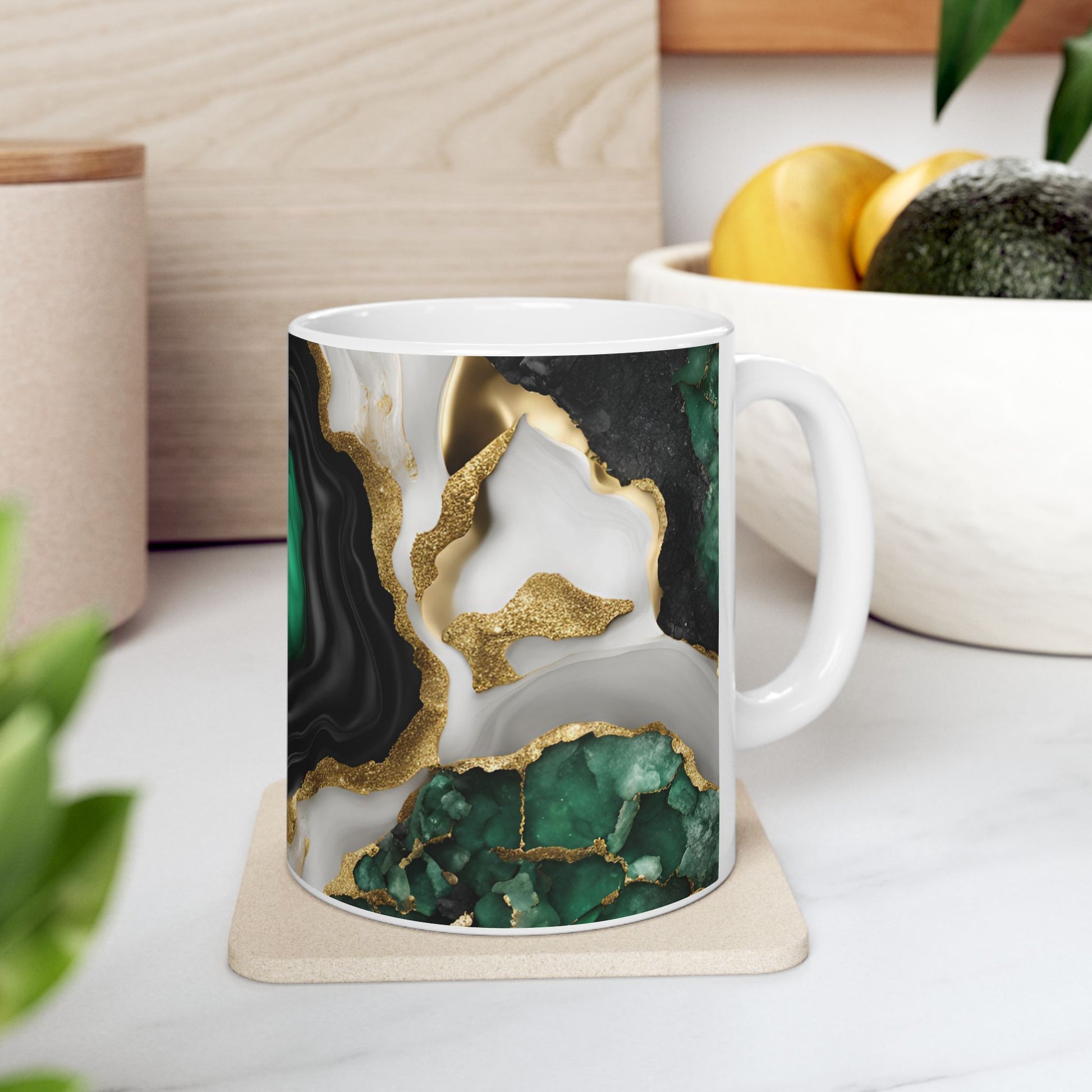 Black, White, Emerald Gren and Gold Amethyst Crytal Geode Design Mug perfect for coffee, tea and hot chocolate that makes a great gift for yourself or the Marble or Rock Lover in your life! We've created a beautiful blue quartz image that is sublimated onto a ceramic mug and wraps around the mug. It's BPA and Lead-free, microwave & dishwasher-safe, and made of white, durable ceramic in 11-ounce size. The perfect gift for coffee, tea, and chocolate lovers as well as your picky and hard to shop for friends and family members for birthdays, Christmas, Valentine's Day or just to say you are thinking about them. We are so pleased to be able to offer this very popular mug design. All mugs feature a comfortable C-handle and a shiny finish so that they're both easy to use and great to look at. Be sure to check out our store's uniquely designed wall clocks as well! ** Please note that all of our mugs are made of ceramic material only and do not contain any precious metals, minerals, crystals, marble, quartz or gemstones.