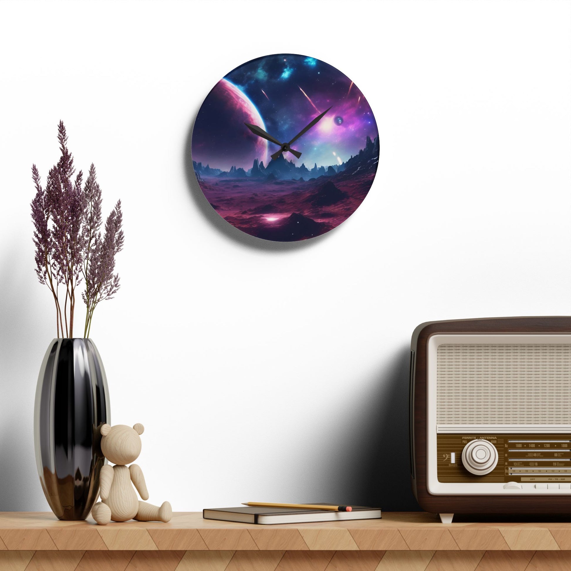 Bring the magic of outer space into your home with this stunning acrylic clock. Featuring a mesmerizing design inspired by the mysteries of the universe, this piece will add a touch of cosmic beauty to any room. Perfect for space lovers and anyone who appreciates the wonders of the cosmos. Brighten up your space with this unique outer space wall clock today!