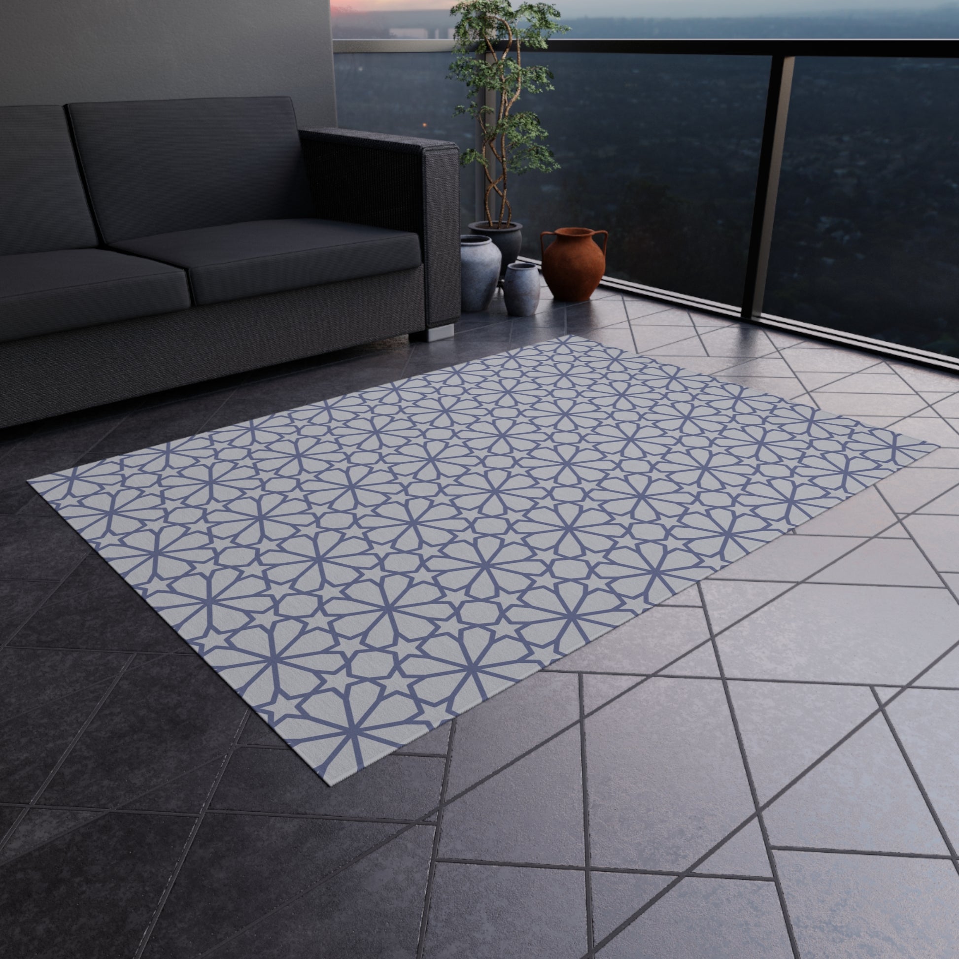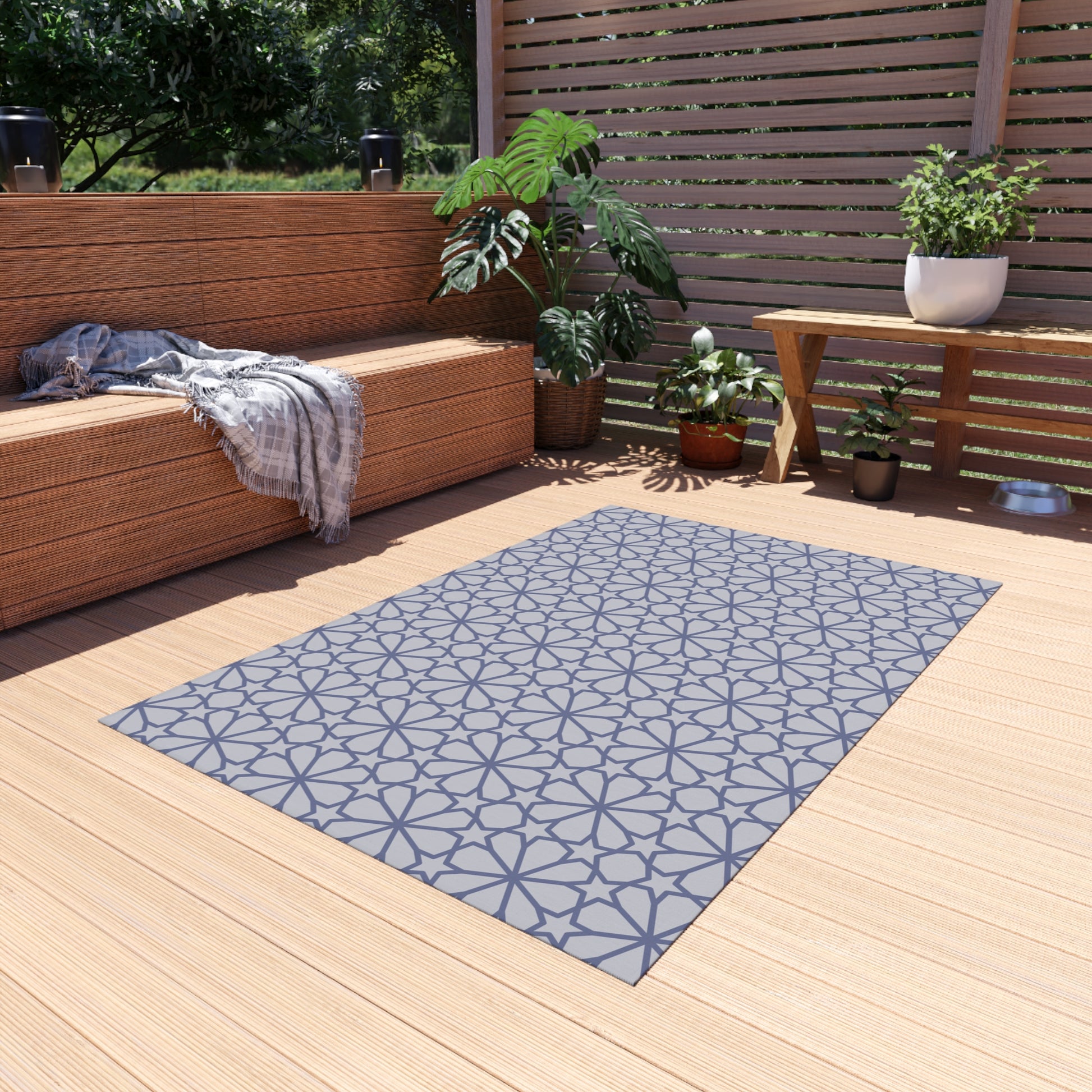 Elevate your outdoor space with this durable and breathable polyester chenille rug! Featuring a no-skid polyester backing for added safety, hemmed edges for a polished look. Perfect for adding style and comfort to your outdoor oasis. Our non-slip outdoor rugs bring alfresco entertaining to a whole new level of comfort. These rugs come in many different sizes to fit any patio or porch. Made from polyester chenille fabric— they're very durable, breathable, and dry quickly. .: Material: 100% polyester chenille front .: Multiple sizes .: Hemmed edges .: No-skid polyester backing Note: Many of our beautiful and unique designs are made with the assistance of AI