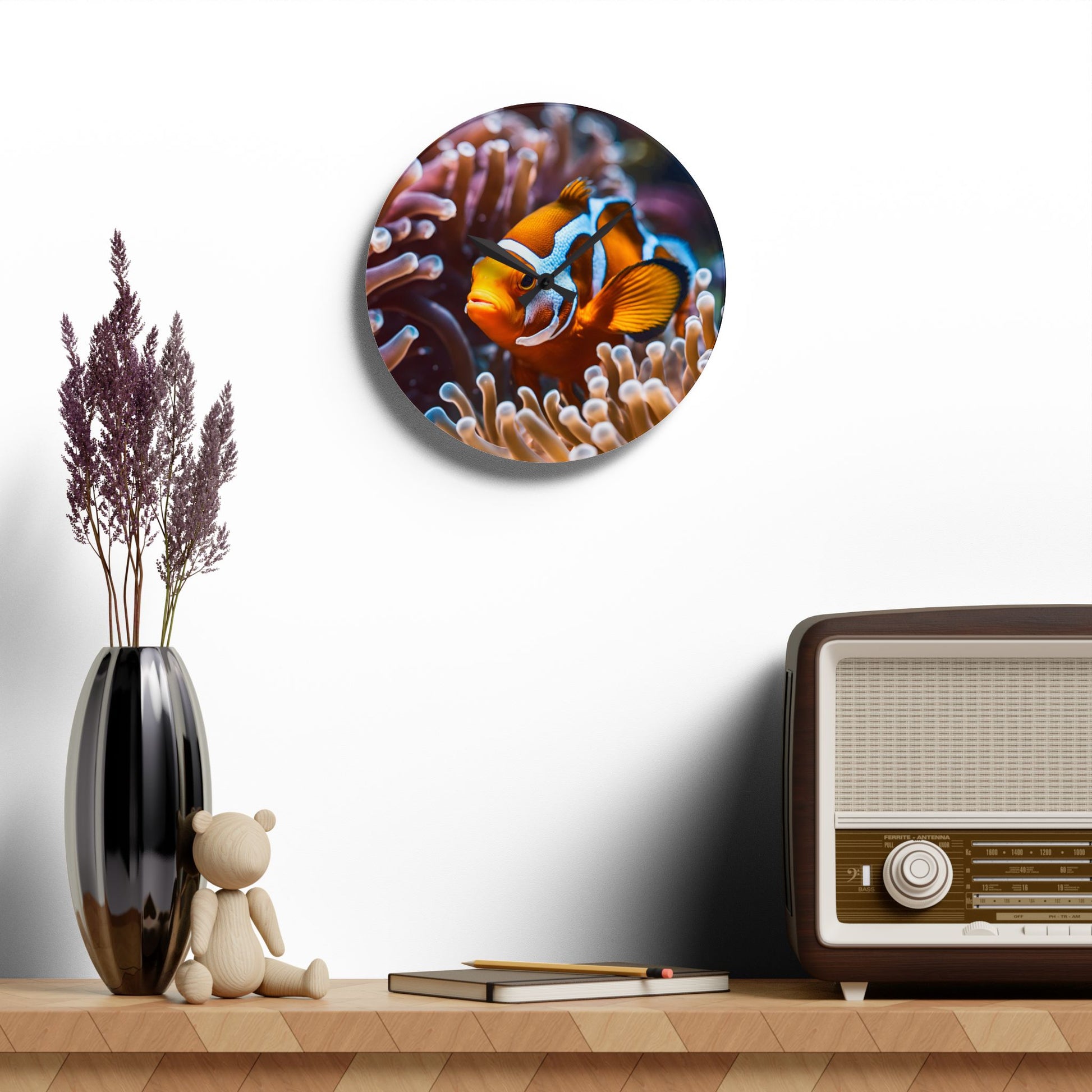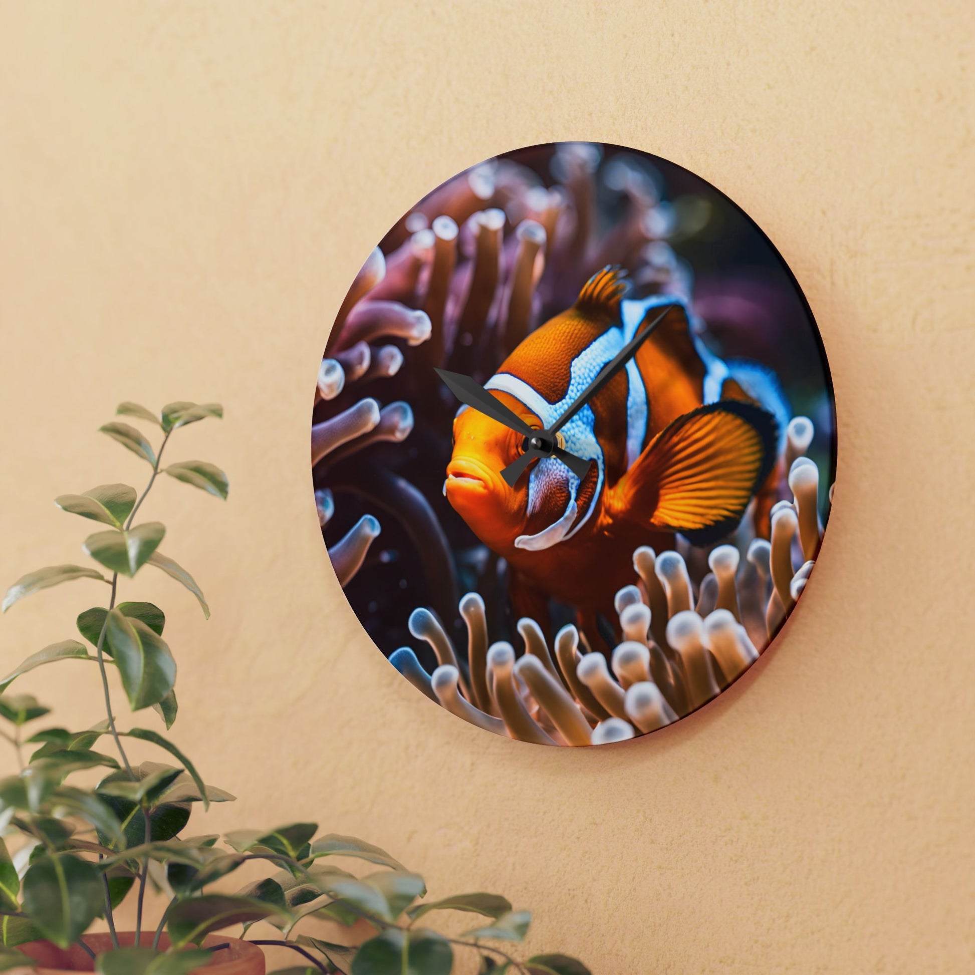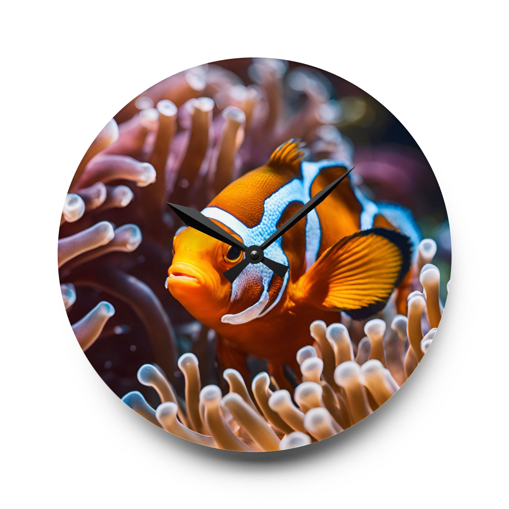Clown Fish Anenome Design Acrylic Clock Unique Colorful Wall Clock for Kitchen or Living Room Nature Lover Gift