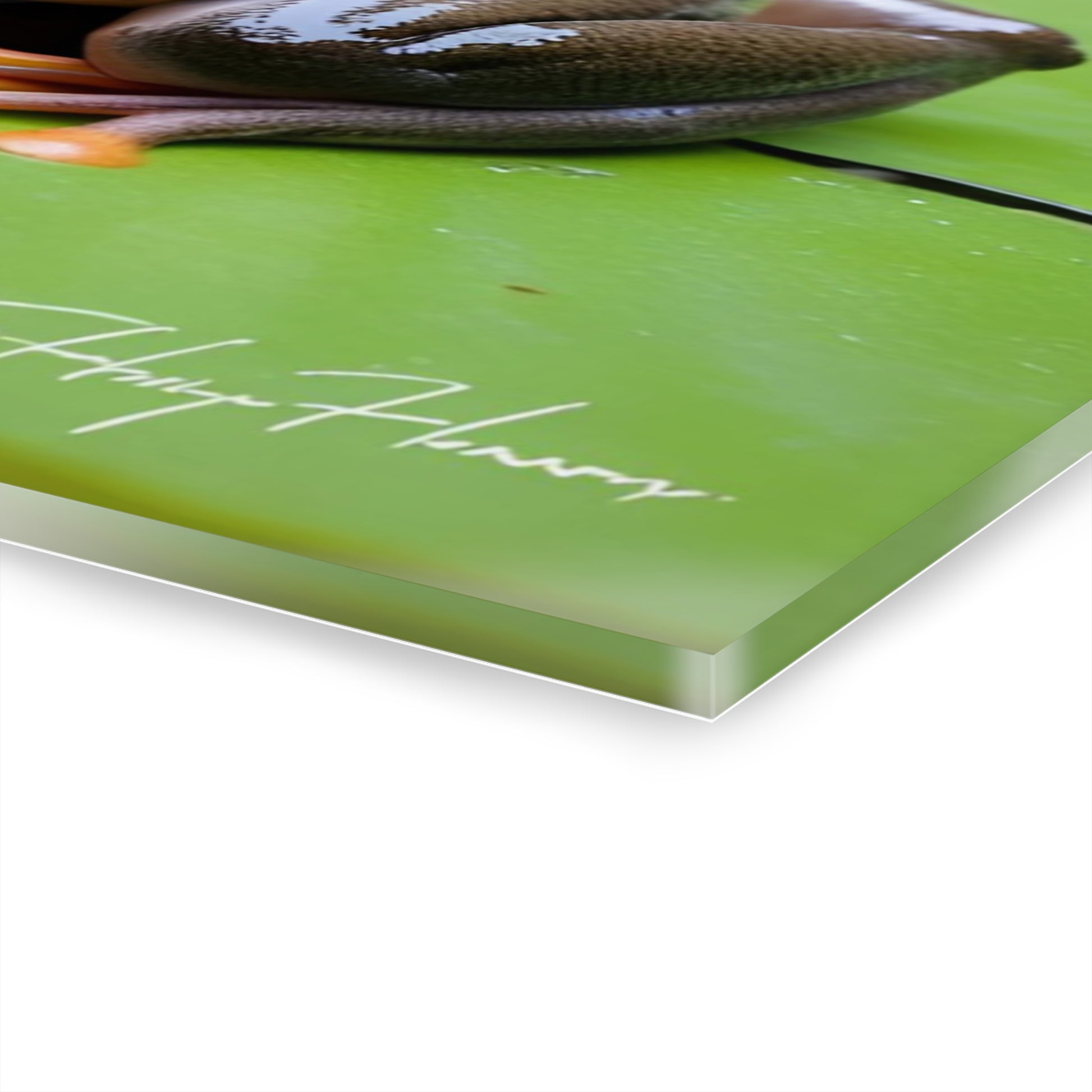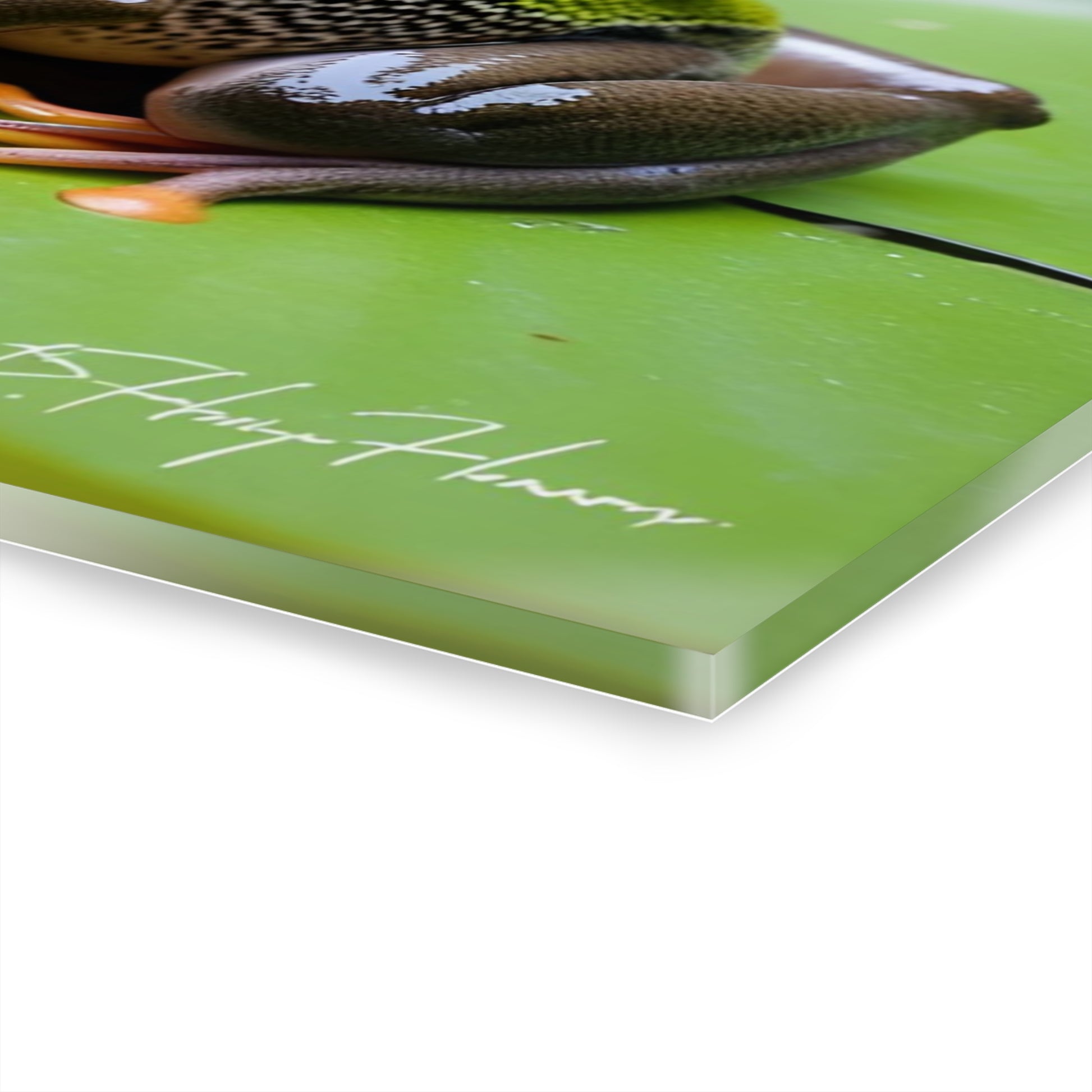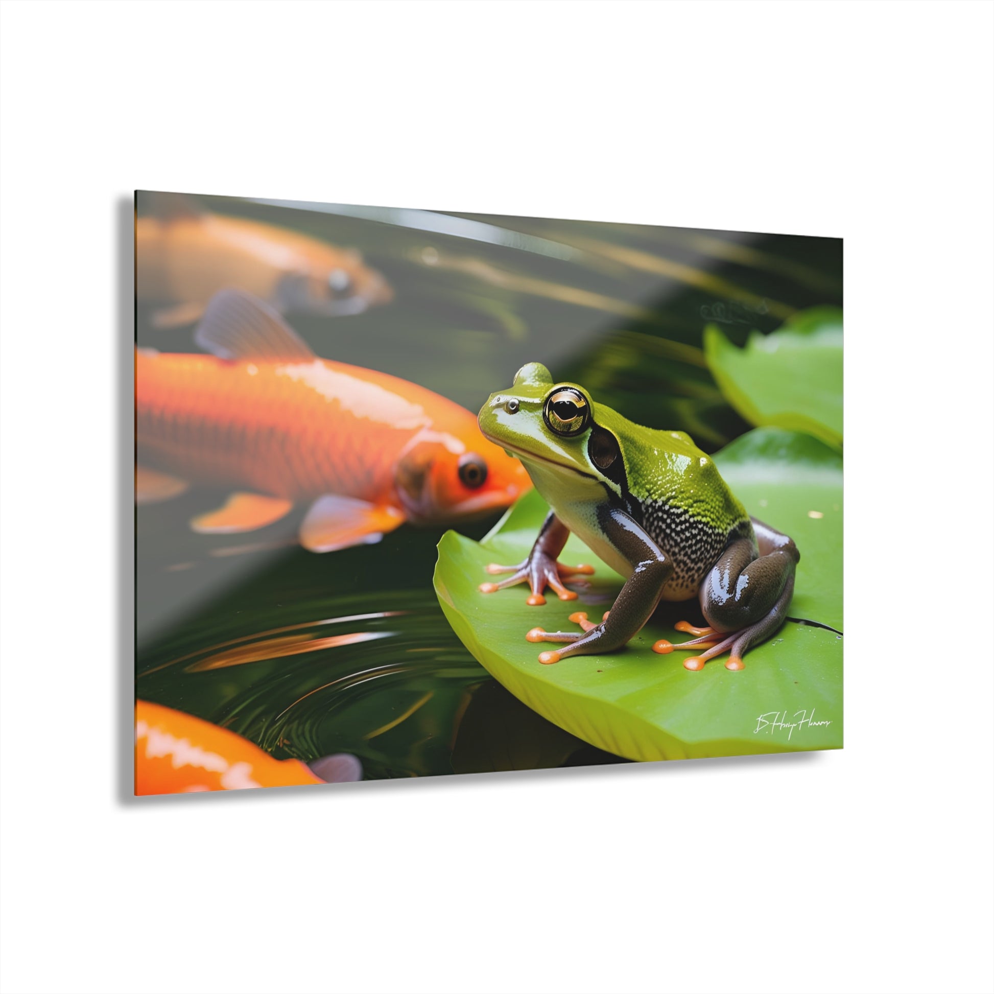 Green Frog on Lily Pad Acrylic Print with Carp in Pond Nature Lover Wall Art Animal Lover Gift Artwork Modern Garden Home Decor