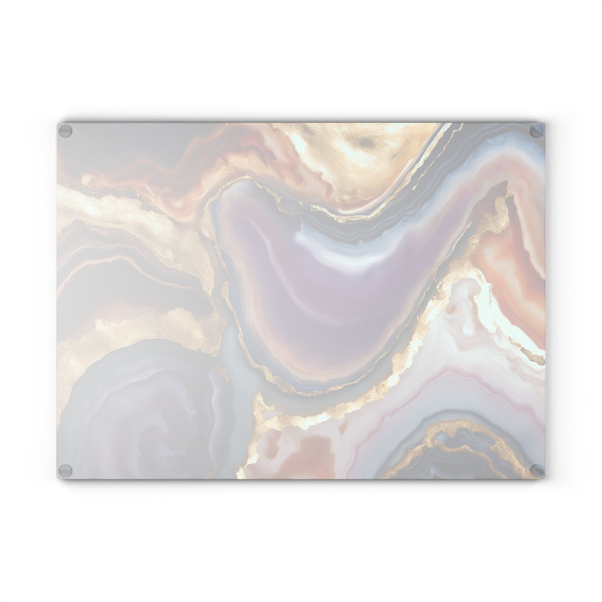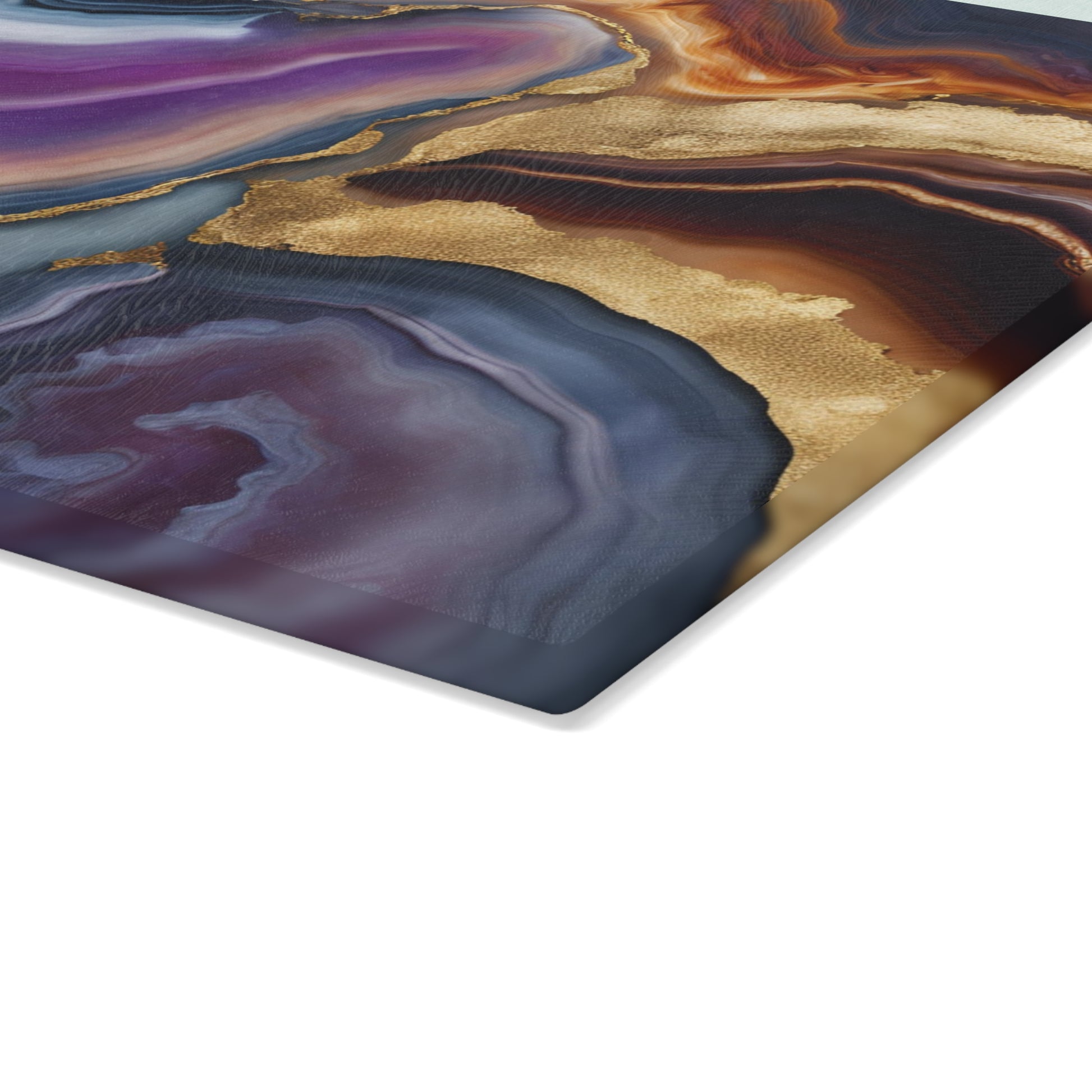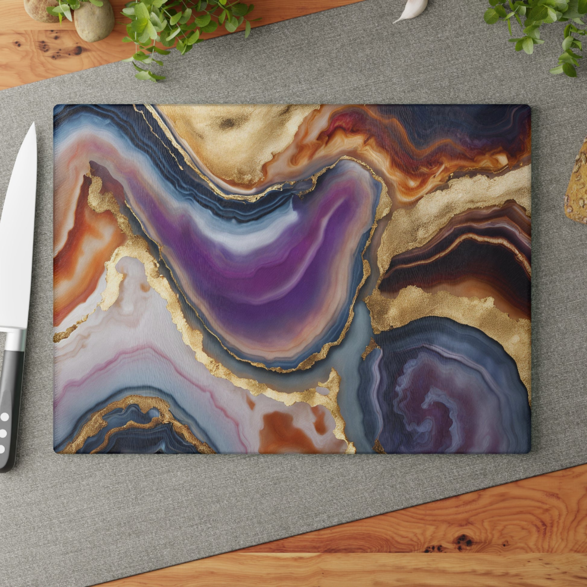 Add a touch of elegance to your kitchen with this stunning agate and geode design glass cutting board. The unique patterns and vibrant colors will make meal prep a stylish experience. It can also be used as a beautiful cheese plate, appetizer serving tray or charcuterie board. This tempered glass cutting board is not only functional but also a beautiful keepsake piece of decor for your space. Elevate your kitchen with this eye-catching geode design glass cutting board today!
