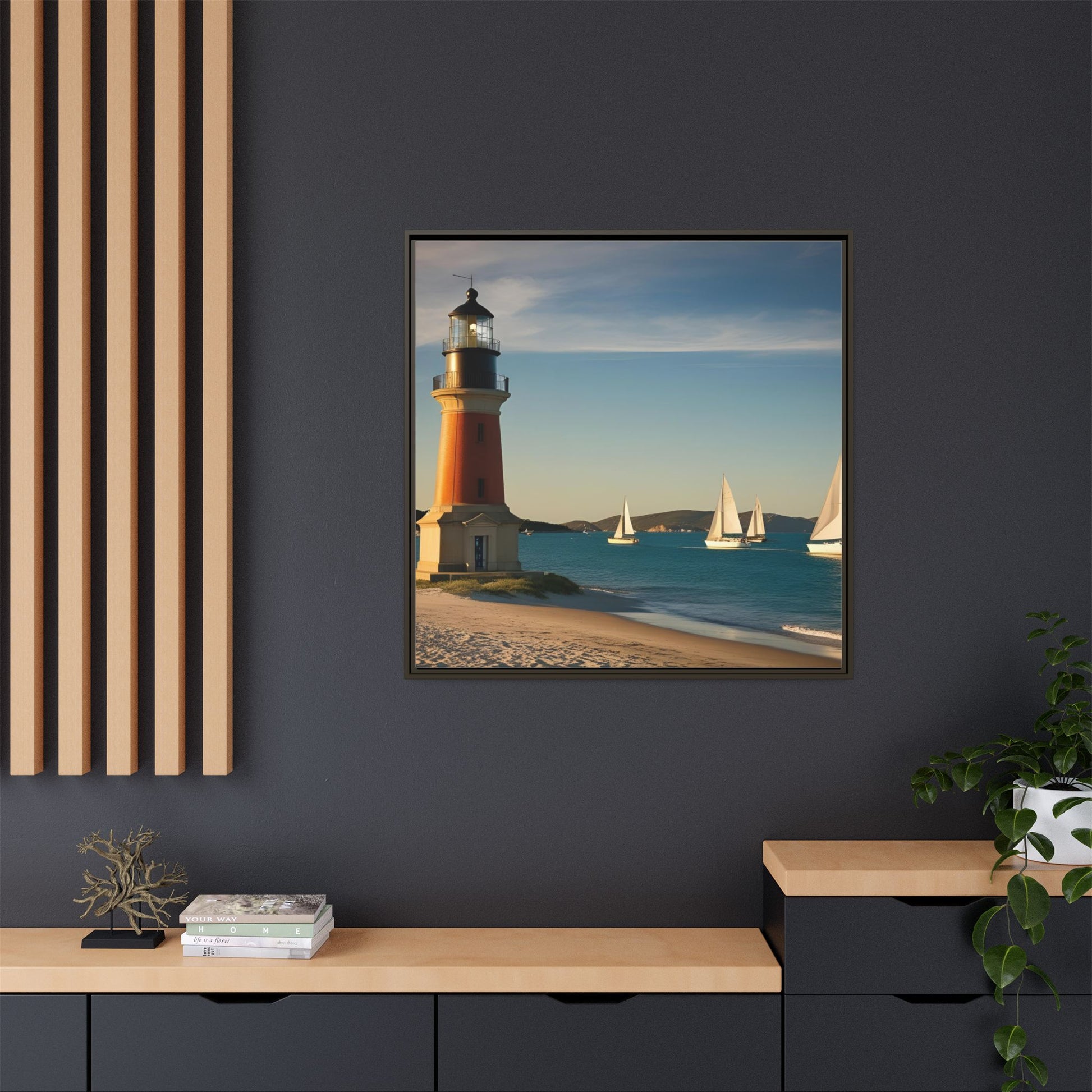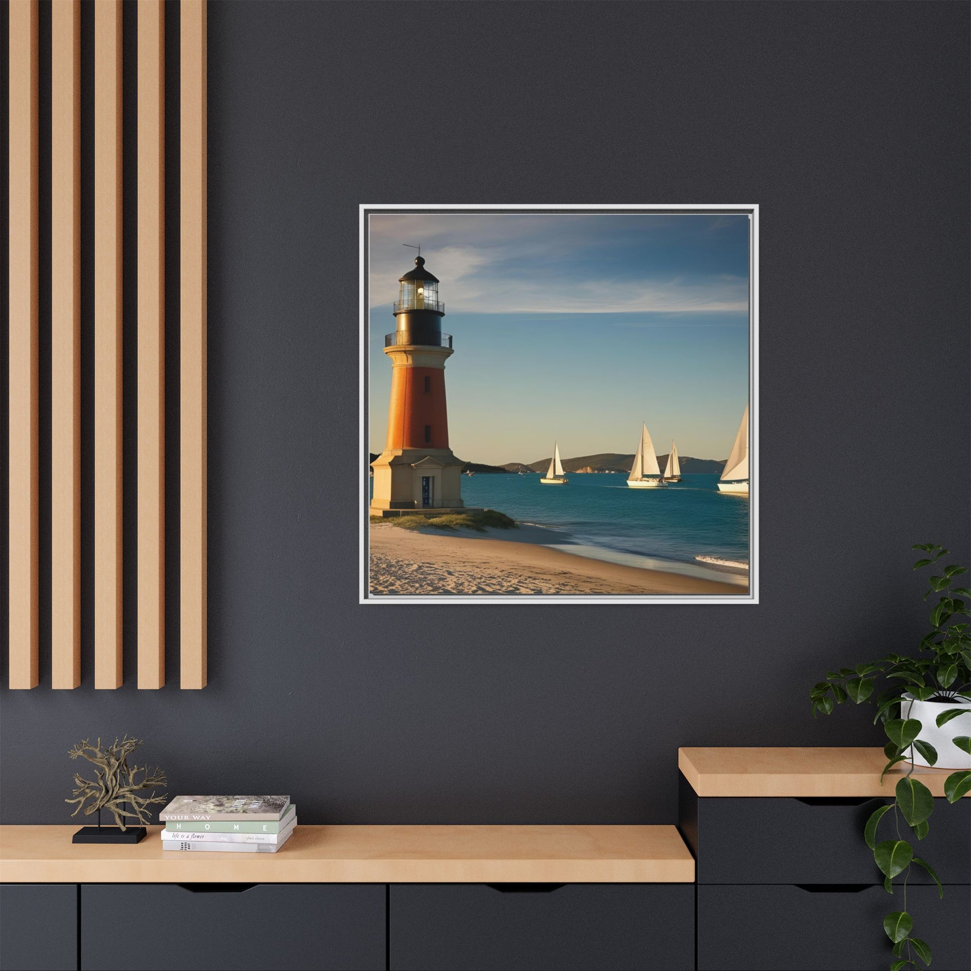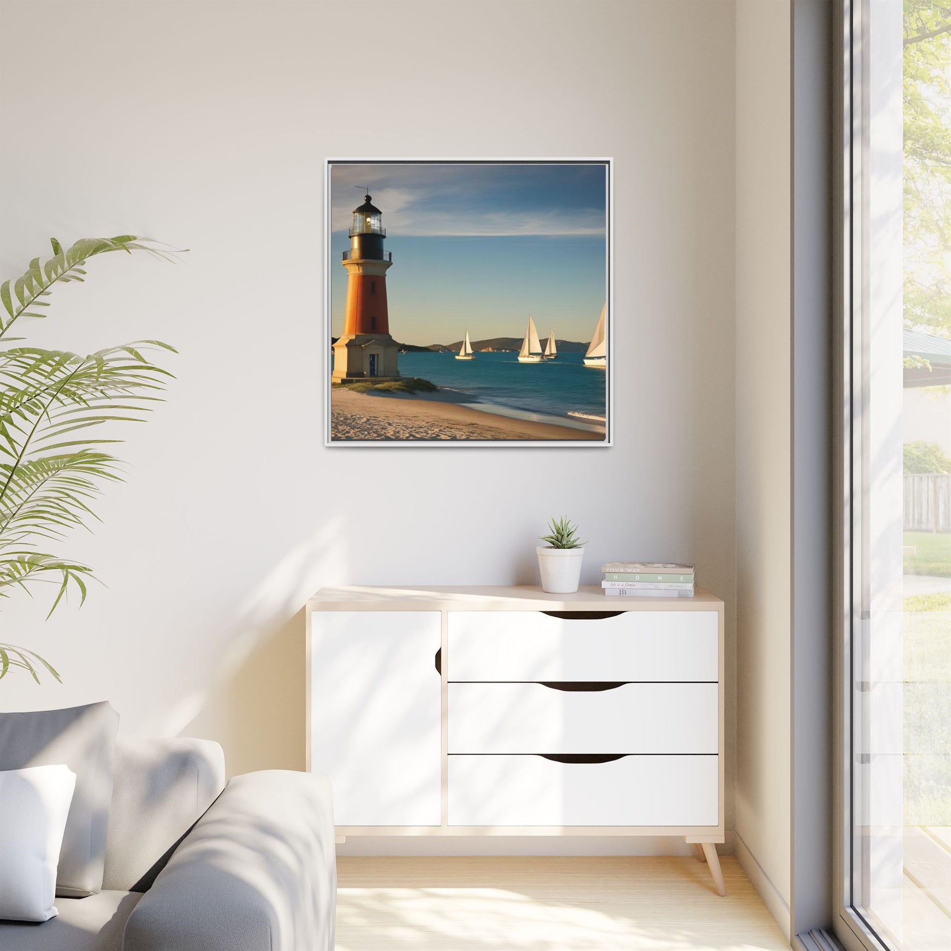 Lighthouse on the Beach Unique Framed Canvas Print Wall Art Nature Lover Gift Beachy Sailboats in the Ocean Vacation Decor 3 frame colors