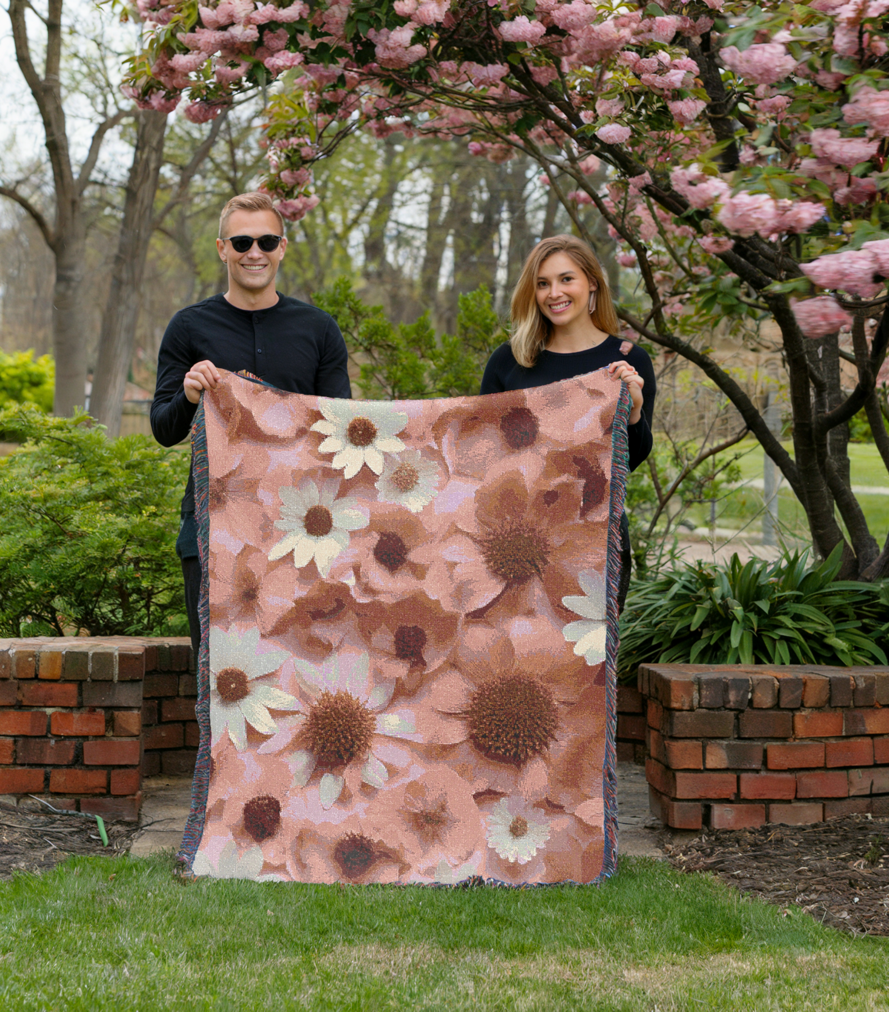 Pink Daisies Cozy Reading Throw for Book Lovers Cotton Woven Fringed Picnic Blanket Wall Art