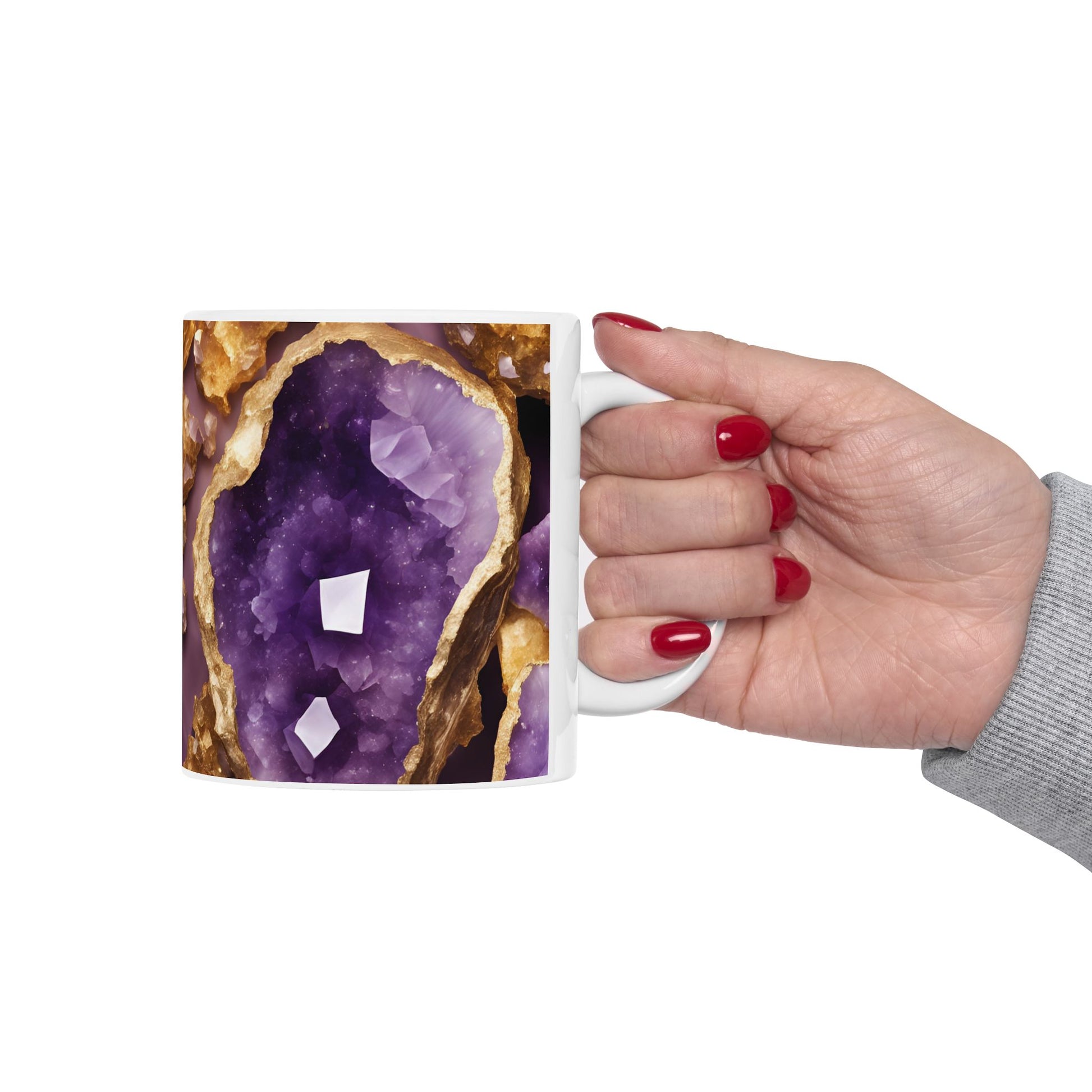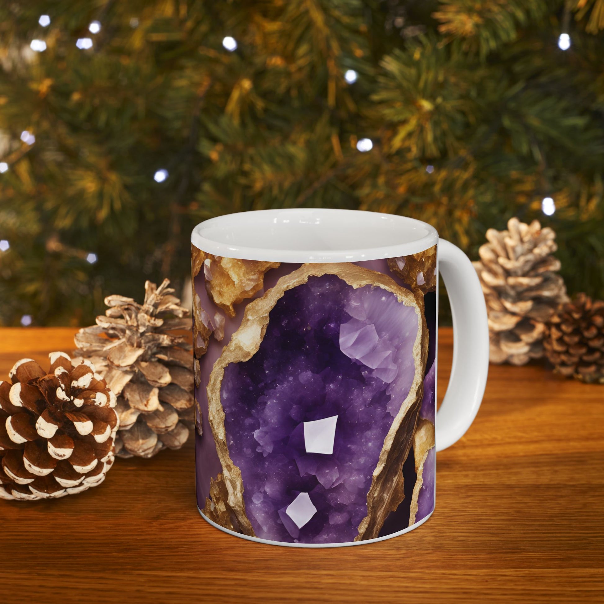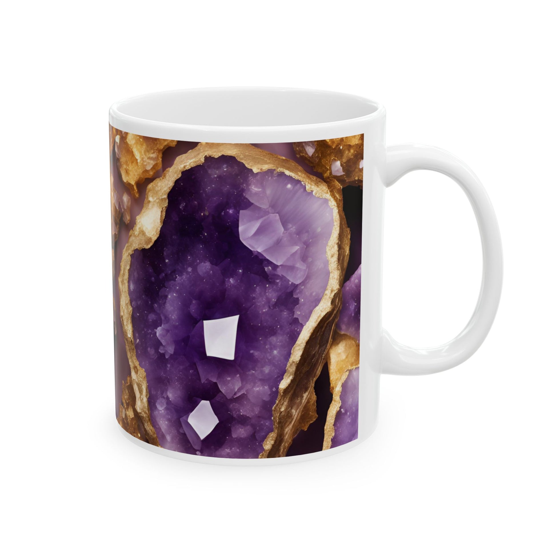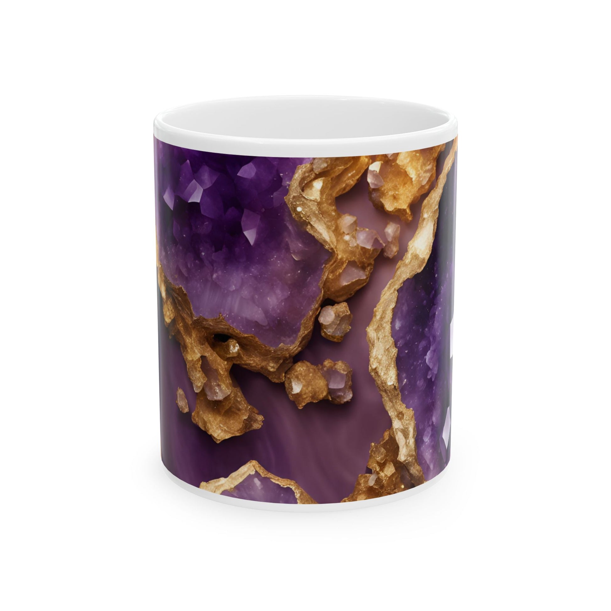 Purple and Gold Amethyst Crystal Design Mug perfect for coffee, tea and hot chocolate that makes a great gift for yourself or the marble or Rock Lover in your life! We've created a beautiful purple quartz image that is sublimated onto a ceramic mug and wraps around the mug. It's BPA and Lead-free, microwave & dishwasher-safe, and made of white, durable ceramic in 11-ounce size. The perfect blingy gift for coffee, tea, and chocolate lovers as well as your picky and hard to shop for friends and family members for birthdays, Christmas, Valentine's Day or just to say you are thinking about them. We are so pleased to be able to offer this very popular mug design. All mugs feature a comfortable C-handle and a shiny finish so that they're both easy to use and great to look at. Be sure to check out our store's uniquely designed wall clocks as well! ** Please note that all of our mugs are made of ceramic material only and do not contain any precious metals, minerals, crystals, marble, quartz or gemstones.