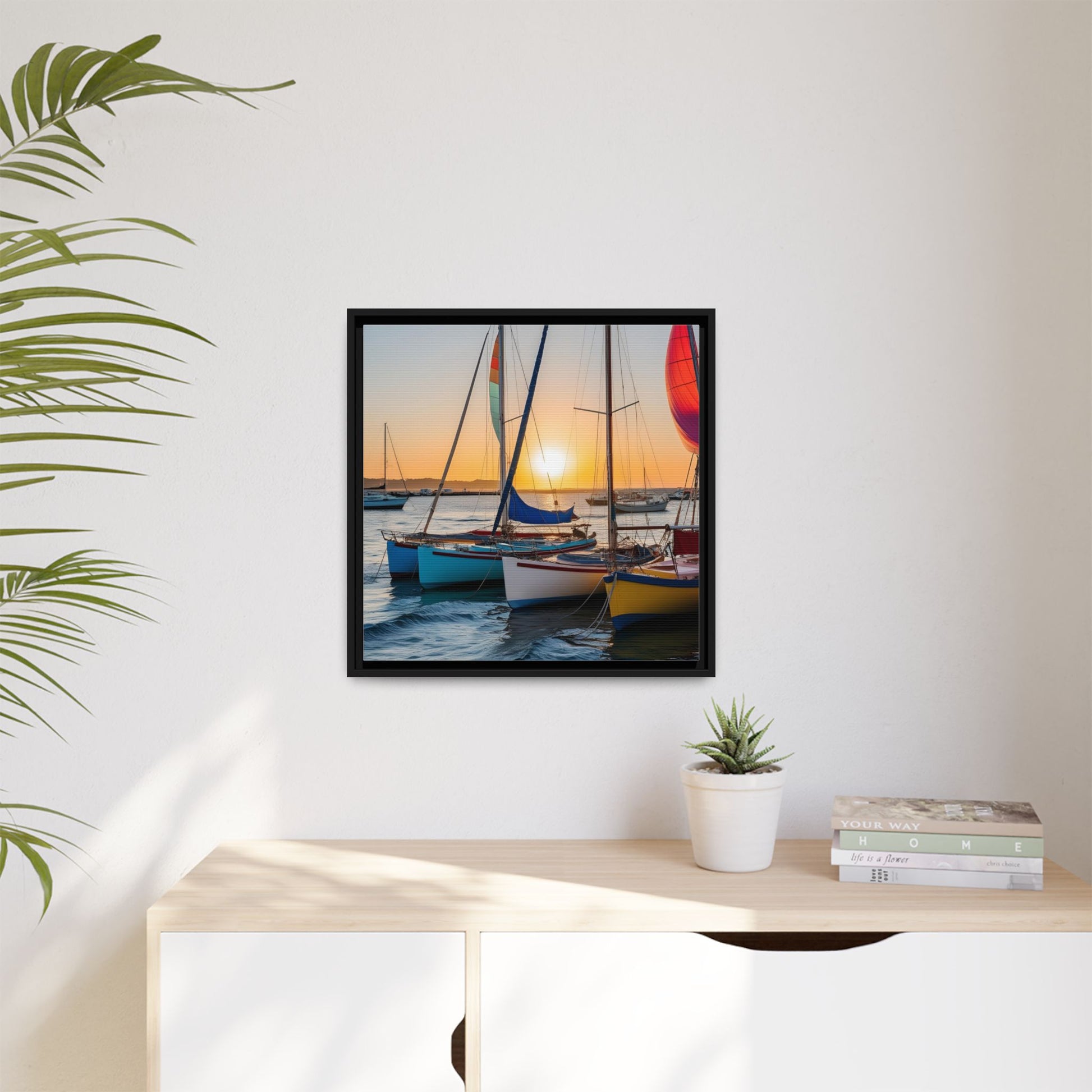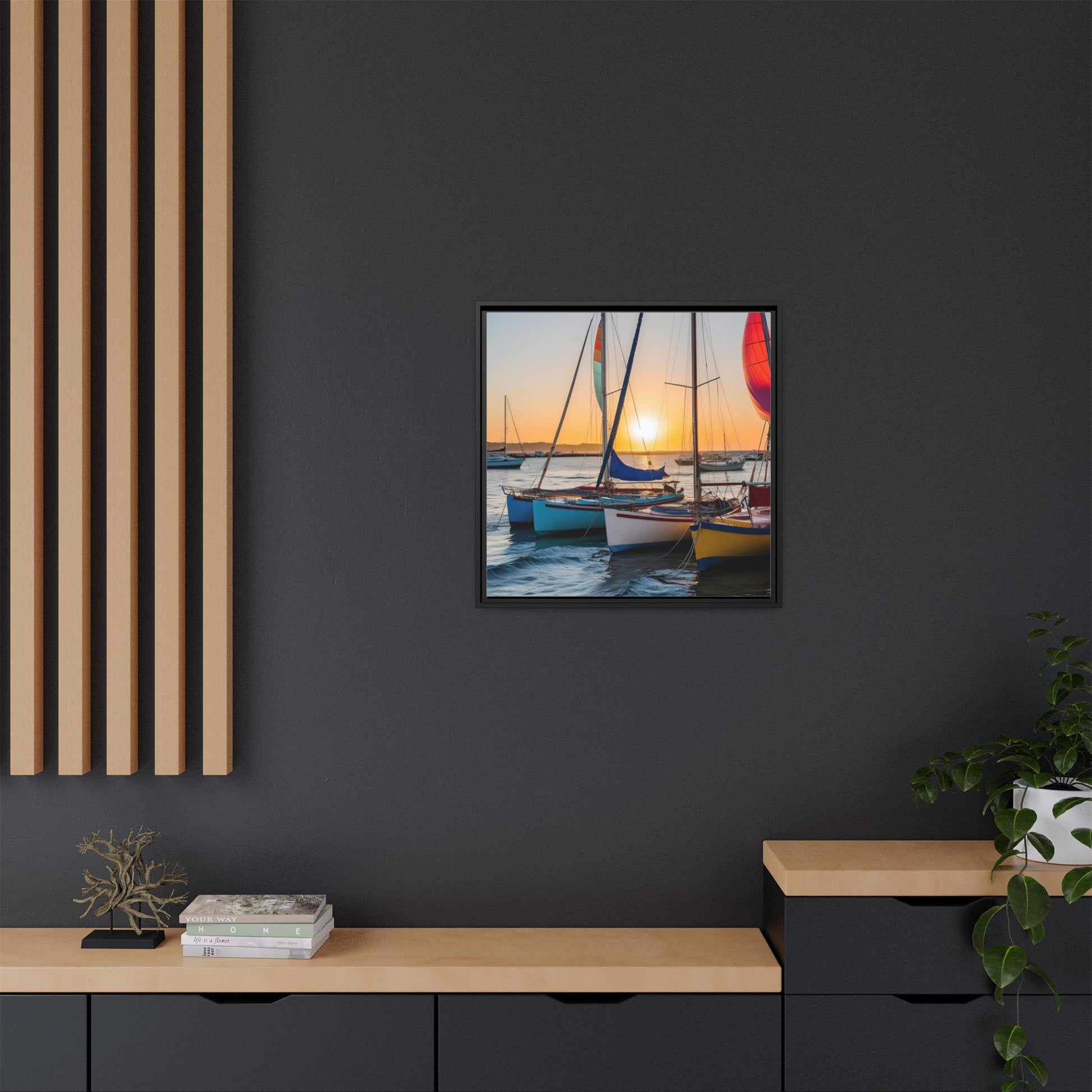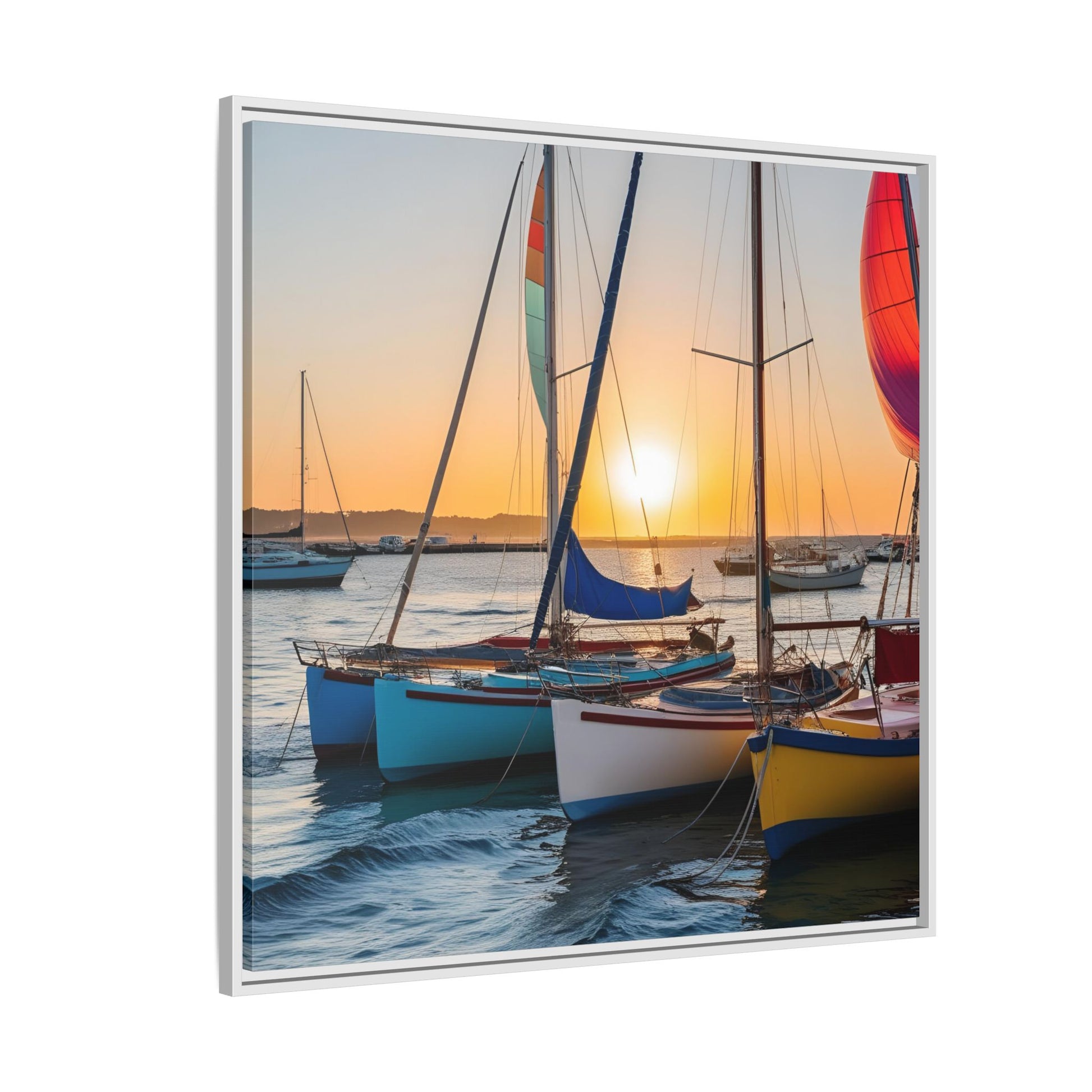 Sailboats at Sunset in Harbor Framed Canvas Wall Art Beach Lover Vacation Oceanic Gift Nature Lover Peaceful Zen Sunrise Art 3 frame colors